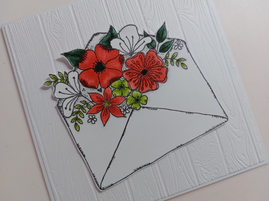 I stamped the enevlope of flowers onto a spare piece of card and coloured it with my Stampin’ Up! Write pens (poppy parade, granny apple green & evening evergreen), which were the nearest I had to the challenge colours. I used a SU blender pen as well, so I could get shading with the marker pens. After shading around the flowers with a pencil, I fussy cut the image and attached it to the card front, using a scrap bit of card on the back to lift it slightly.