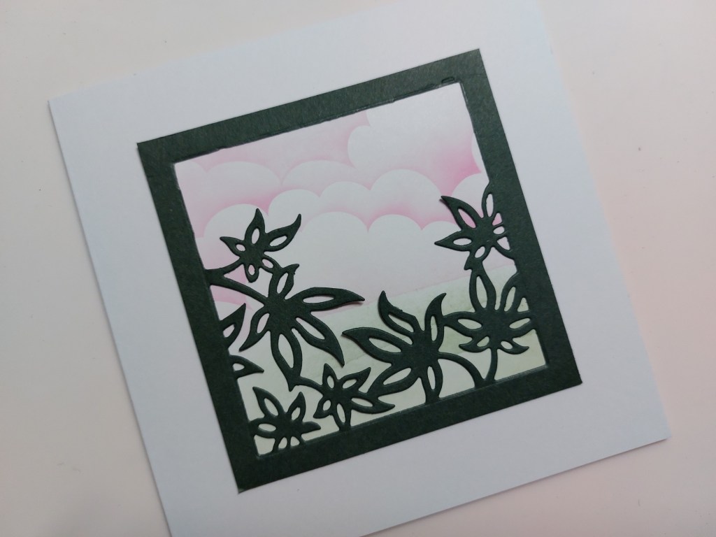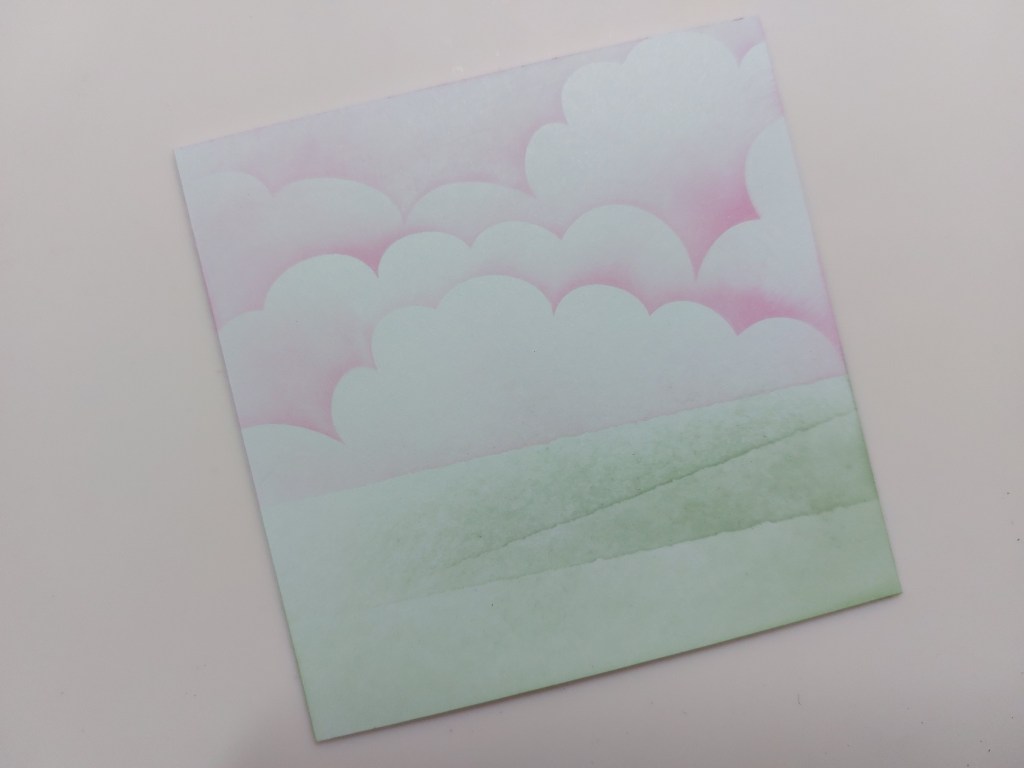 I cut a square of white card fractionally small than the green one, and created a pink sky with Clarity’s ‘clouds’ mask, a blending brush and ‘kitsch flamingo’ Distress Oxide. I tore a scrap of copy paper and blended ‘iced spruce’ across it to create the land.