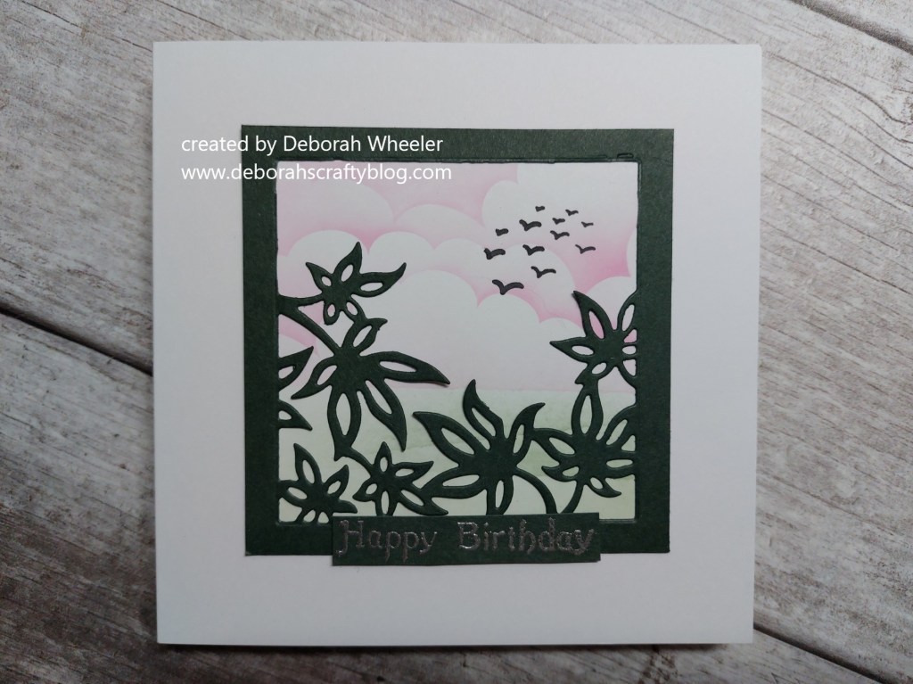 I stamped the sentiment with WOW clear ink onto a piece of the ‘evening evergreen’ and heat embossed it in silver before adding it to the frame. The final touch was a flock of birds heading off into to the distance, stamped in black Versafine Clair.