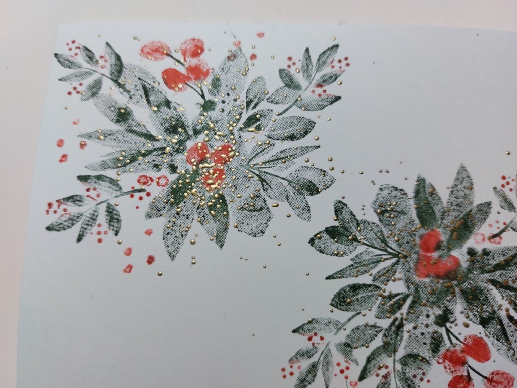 I needed to add the gold from CTD’s palette, so decided to sprinkle WOW’s gold metallic ultra high embossing powder over the leaves and berries. It’s quite an easy technique – you just need to heat the powder from below the card so it doesn’t blow away and make sure you keep the piece of card level until it’s set! It’s a great effect on the leaves.