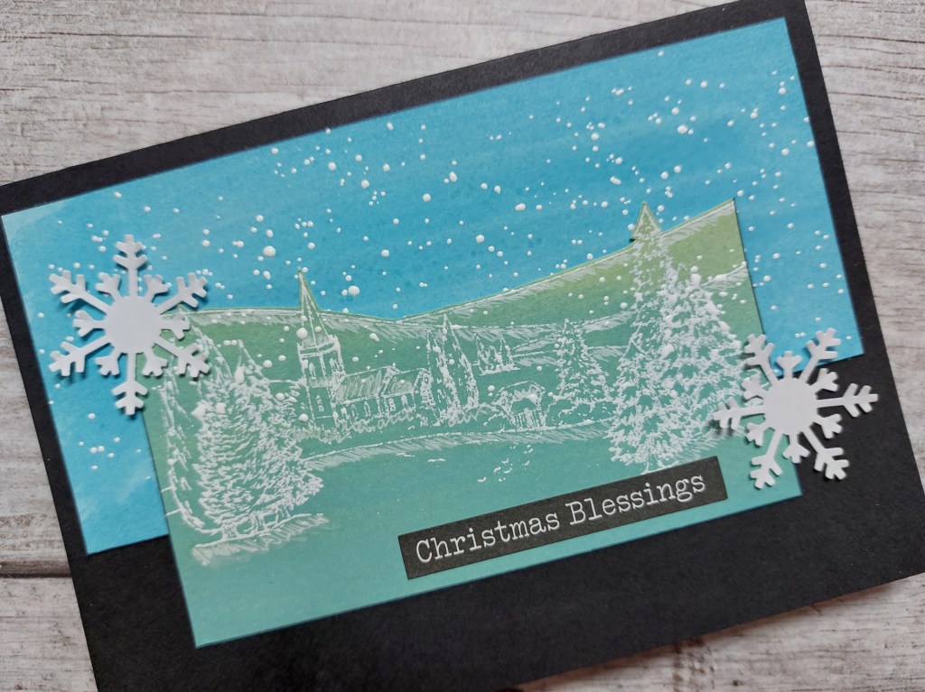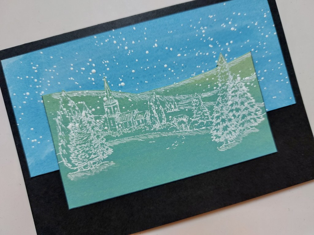 I dried it thoroughly with my heat gun, then cut a piece of the blue from the top. I sprinkled WOW’s ultra high white powder onto it (for snow) and heat set it – you need to do this from below the card, otherwise the powder just blows away! Once set, I attached it to a black A6 card blank.