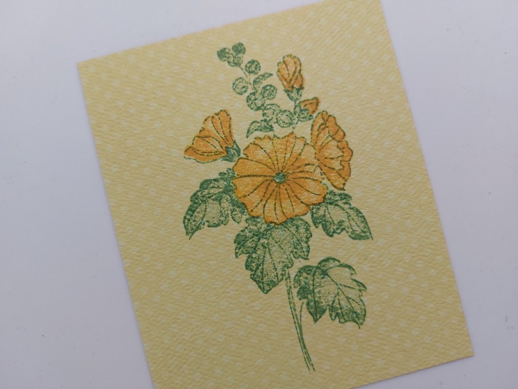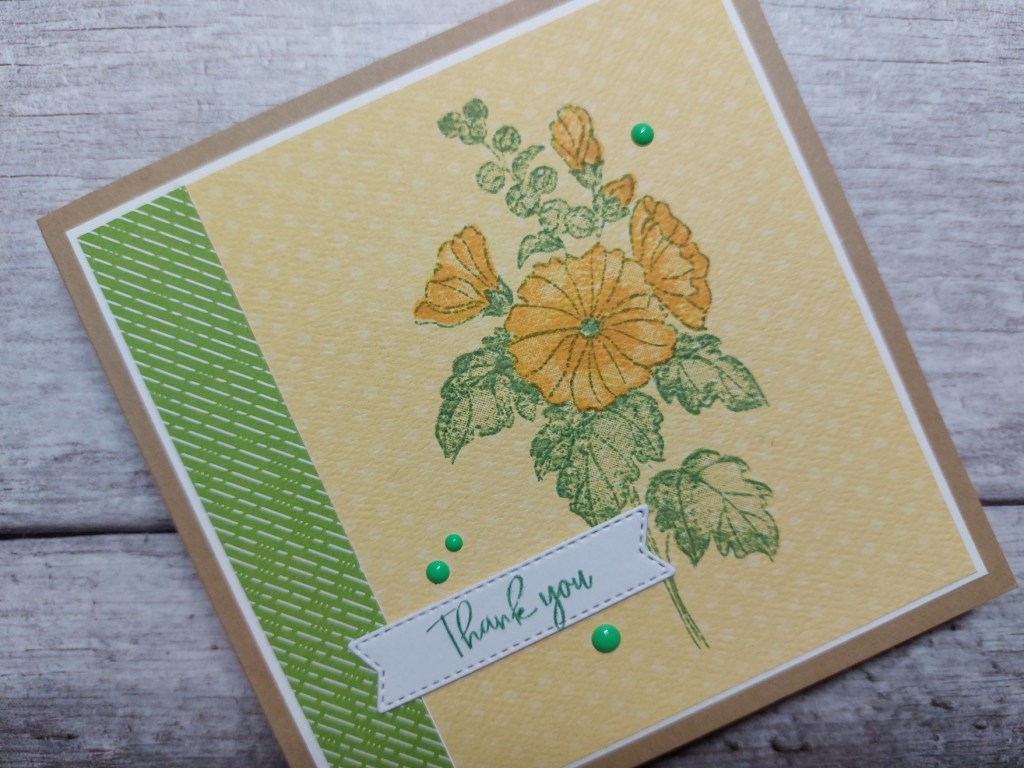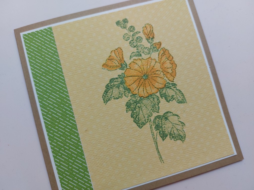 Now my new Stampin’ Up! goodies have arrived ahead of the launch of the new mini catalogue in January and I went for the ‘beautifully happy’ stamp set that will be part of the Saleabration freebies that you’ll be able to get with qualifying orders. It was perfect for picking up the flowers in Jan’s photo. I found a piece of yellow card in my stash and stamped the floral spray onto it, initally using ‘elegant emerald’ Artistry ink for the outline, then using the infill stamps to colour the leaves and flowers (‘elegant emerald’ for the leaves and ‘apricot nectar’ for the flowers).