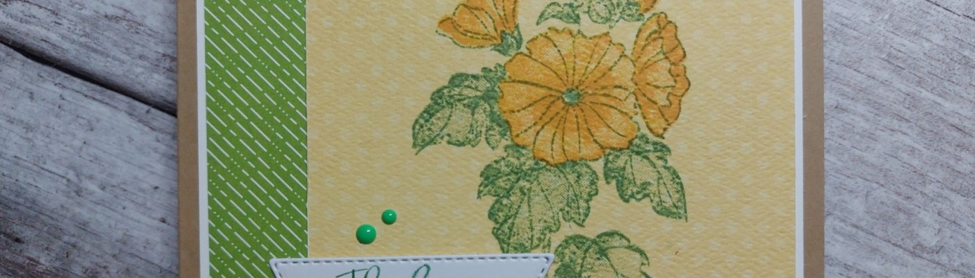 Now my new Stampin’ Up! goodies have arrived ahead of the launch of the new mini catalogue in January and I went for the ‘beautifully happy’ stamp set that will be part of the Saleabration freebies that you’ll be able to get with qualifying orders. It was perfect for picking up the flowers in Jan’s photo. I found a piece of yellow card in my stash and stamped the floral spray onto it, initally using ‘elegant emerald’ Artistry ink for the outline, then using the infill stamps to colour the leaves and flowers (‘elegant emerald’ for the leaves and ‘apricot nectar’ for the flowers).