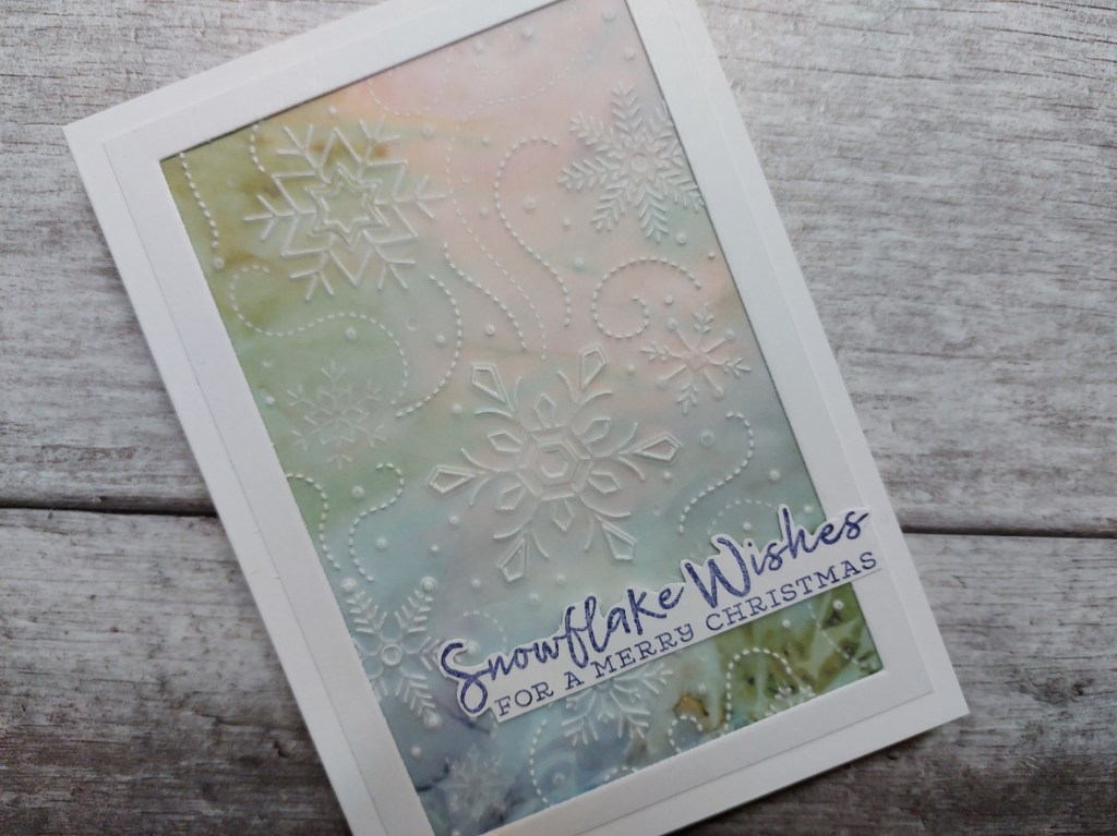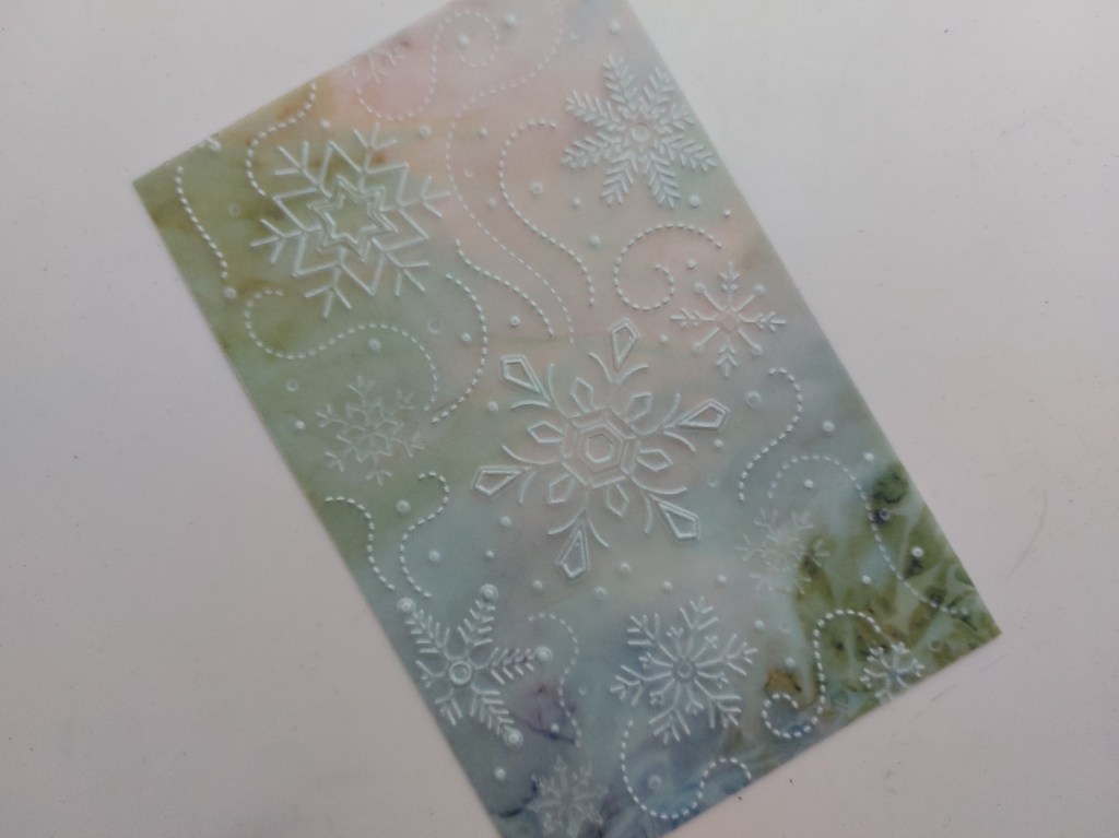 I was playing around with some designer parchment from Clarity and discovered that it worked really well when run through an embossing folder. I used Stampin’ Up!’s ‘wintry’ EF on this piece – it ahs lovely snowflake design which embossed really well onto the parchment.