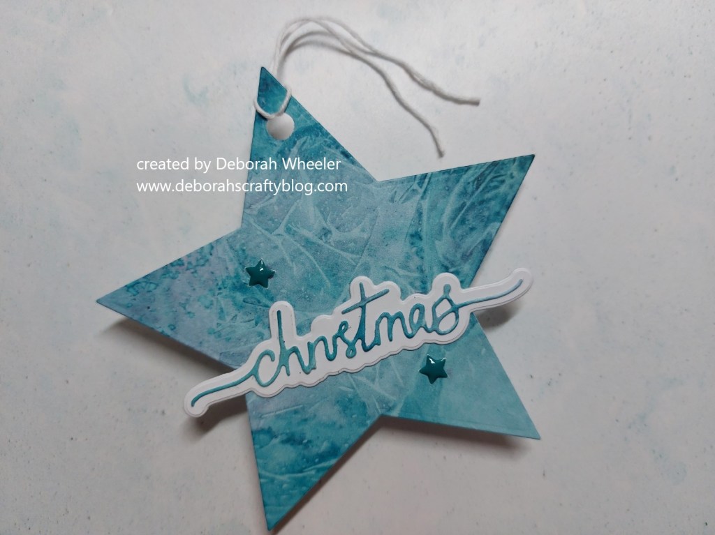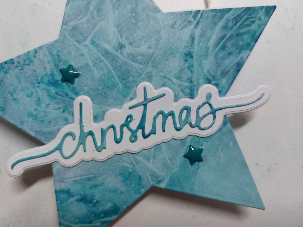 I cut a star using the largest of Julie Hickey’s ‘you’re a star’ dies from a piece of Clarity’s ‘Antarctica’ designer card. I cut the word from Julie’s ‘Christmas profile’ dies in the same card, then used white to die cut the backing layer, glued them together and then glued the whole piece onto the star.