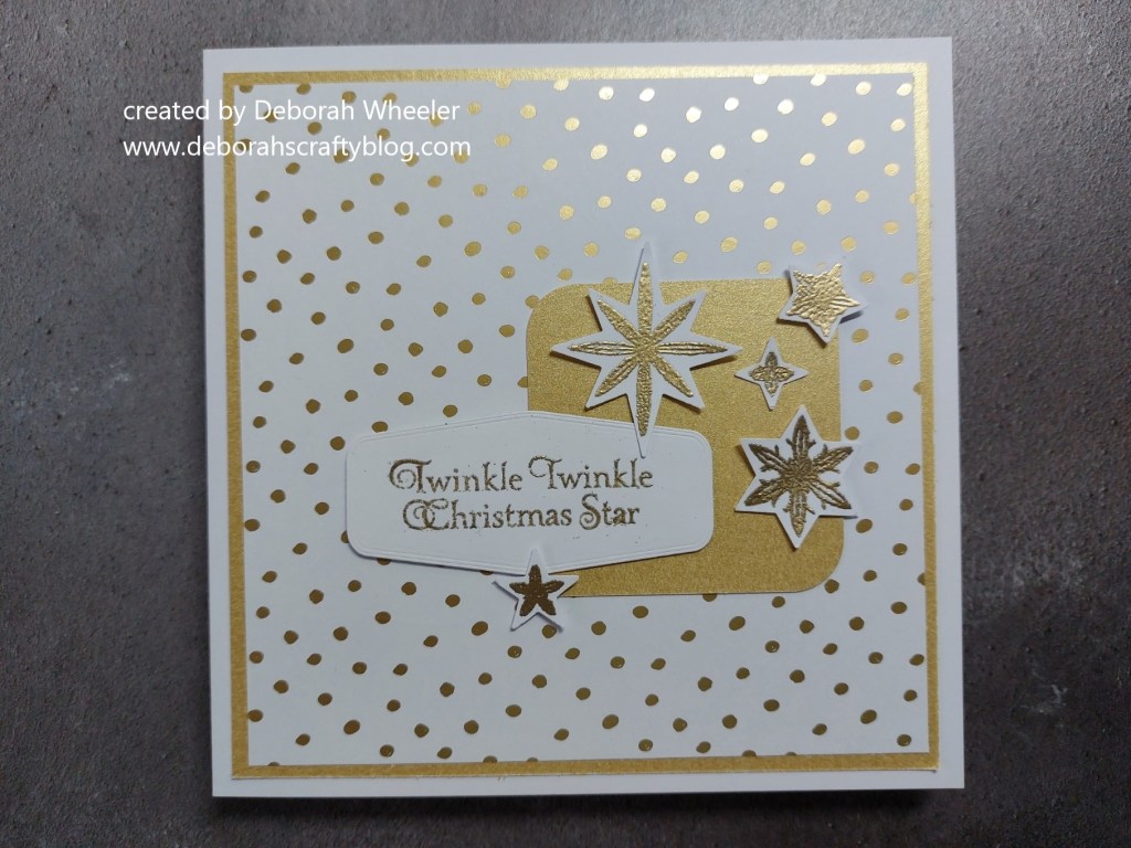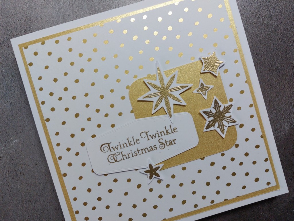 I stamped the group of stars and heat embossed them with the metallic gold, then used the co-oprdinating punch to cut them all out (it does the whole group in one go!) I just added them all to the card front, some on foam pads and others directly to the card, and it was done!