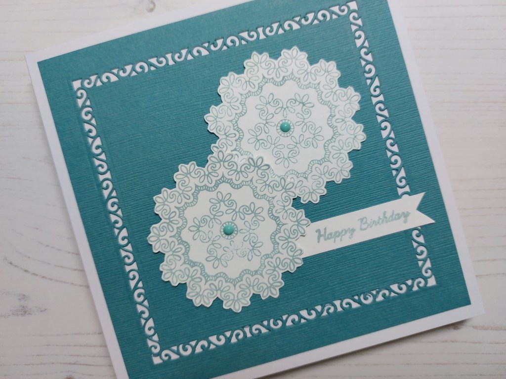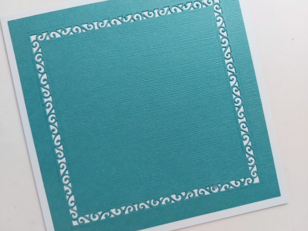 It’s such a lovely intricate design that it had to take centre stage on the card. But first the background – I cut one of Clarity’s ‘doodle frame-it aperture’ dies into a square of teal card and attached it to a 6×6 card blank.