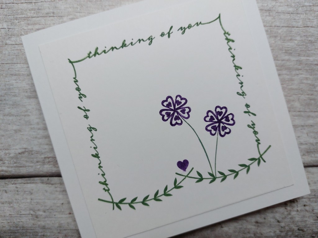I kept it very CAS (clean and simple) for this one – my favourite style! I strated with a square of white card and stamped the leafy strip across the bottom in ‘rustic wilderness’ Distress Oxide. I then added ‘thinking of you’ across the top, again in the green, then stamped the two sides in to form the frame.