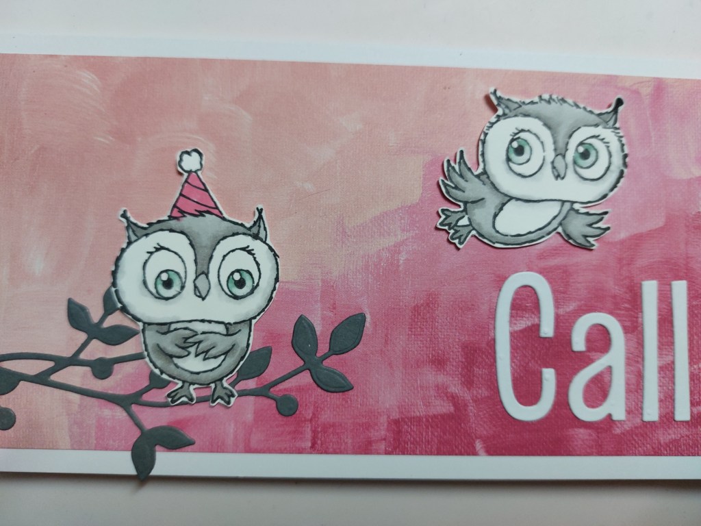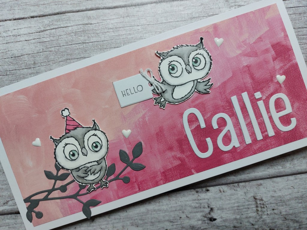 I stamped two of the owls onto white card and coloured them using SU Blends alcohol markers in smoky slate, using ‘mint macaroon’ for their eyes and ‘polished pink’ for the hat. After fussy cutting them, I mounted each onto a small scrap of card and added them to the card front.