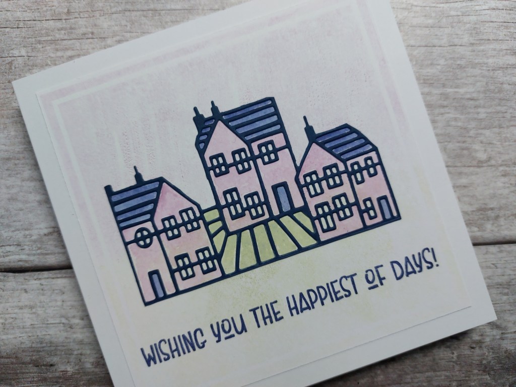 I had originally intended to finish here, but it all looked way too pale. Instead, I used my waterbrush and added ink to the detail of the die cut – ‘fresh freesia’ to the houses, navy for the roofs and doors and ‘bundled sage’ to the ground area. Much better!
