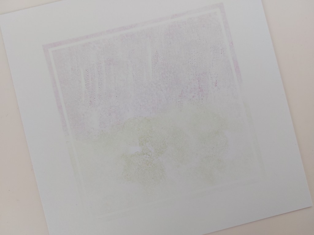 I started with the large square in Clarity’s backdrop stamps and inked it up with SU ‘fresh freesia’ and ‘bundled sage’ Distress Oxide, spreading the ink out of the stamp with small sponges. I gave it a quick spritz with a water spray and stamped it onto a piece of Clarity’s stencil card. The colours are really subtle and it was difficult to get them to show in up well in the photo!