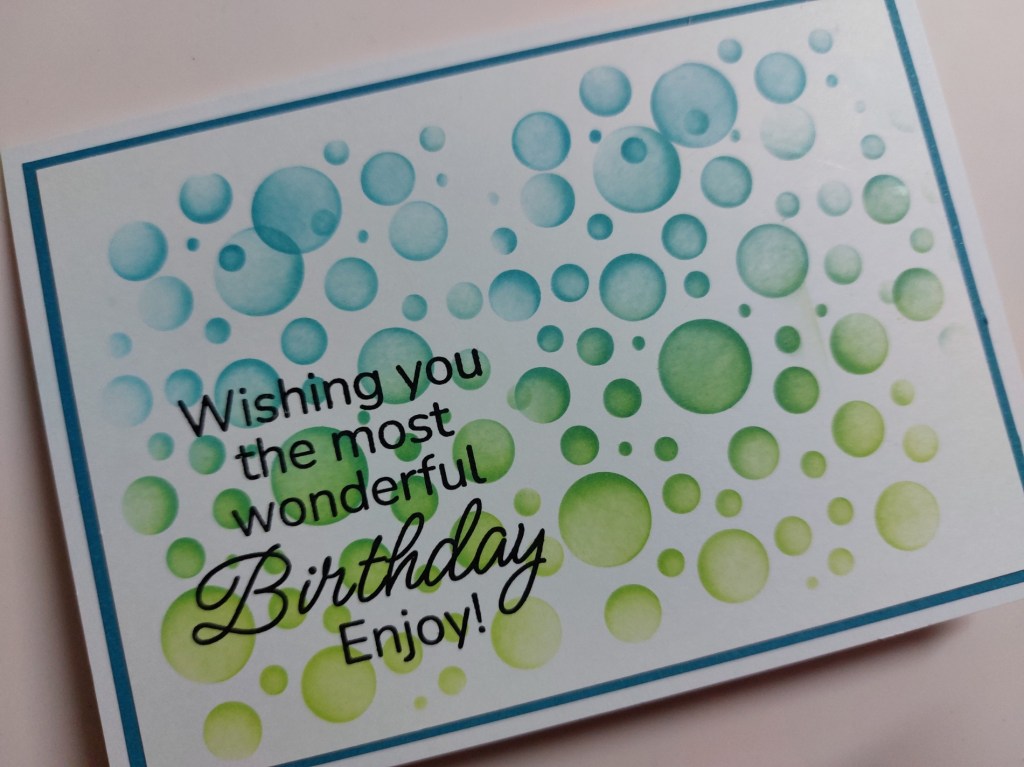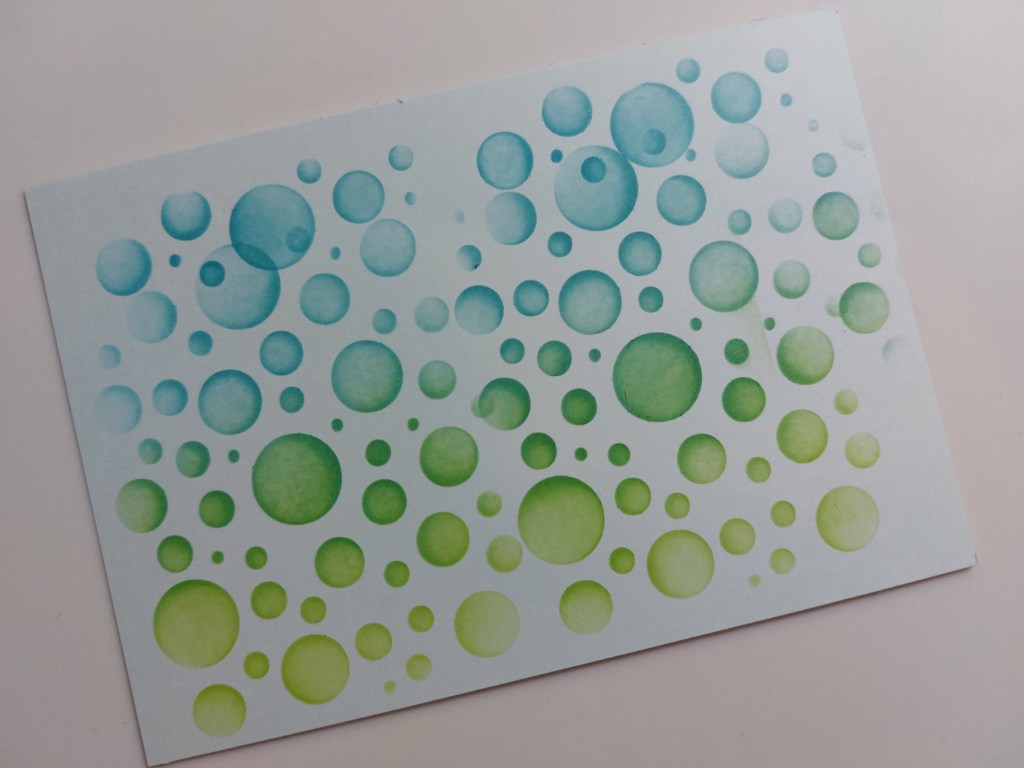 I went back to the fab new products from Julie Hickey Designs that Hazel Eaton created, starting with the ‘backgrounds #2’ stencil that has a great circle design on it and taking inspiration from one of Julie’s cards. I used a blending brush and Distress Oxides in ‘mowed lawn’ and ‘broken china’ to add the background to a piece of card trimed to fit an A2 card blank. I had to reposition the stencil several times, using low tack tape to mask off the other patterns on it.