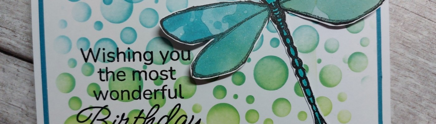 I stamped the large image from ‘Hazel’s dragonfly’ set onto white card, coloured the body with a marker pen and fussy cut it. I stamped the dragonfly again onto a scrap piece of Clarity designer paper, fussy cut the wings and paper pieced them onto the white card. A dab of glue behind the body fixed it to the card front, and I made the wings shimmer with Wink of Stella (although you can’t see it in the photo).
