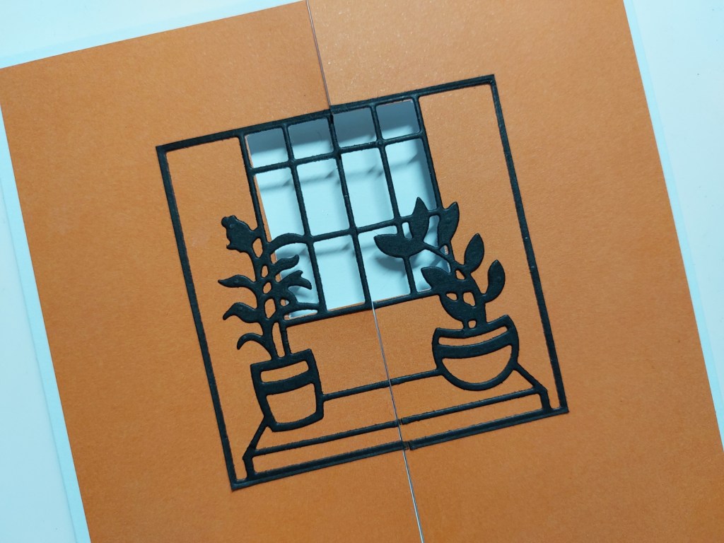 I wanted to have a view through the window (that’s what the die’s called, after all!), so masked off a square on the inside of the card and blended ‘chipped sapphire’ Distress Oxide over a Clarity cloud mask for the sky, then stamped a little flock of birds.