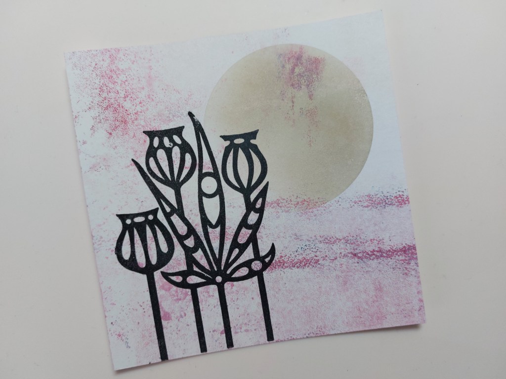 I started with a background piece that I created on Clarity’s retreat last year, using pink acrylic paint and a brayer. I trimmed it down to fit a 6×6 card blank, then created a moon using a circle mask and Distress Oxides in ‘pumice stone’ and ‘walnut stain’. I stamped the ‘funky foliage’ using black Versafine Clair ink.