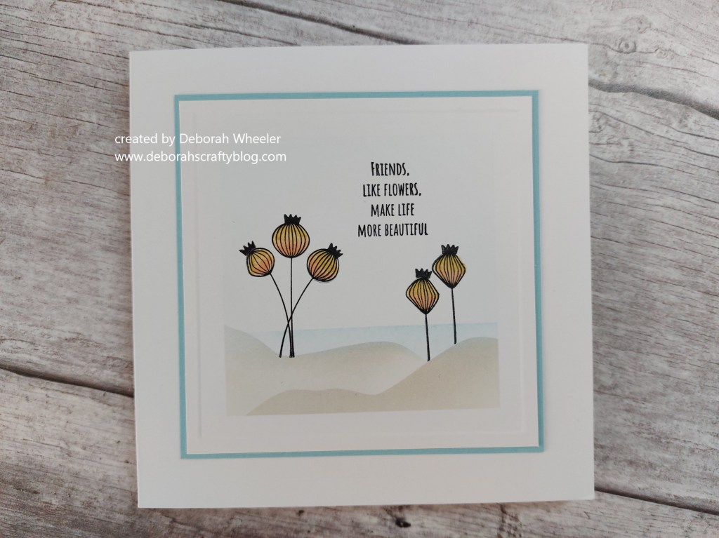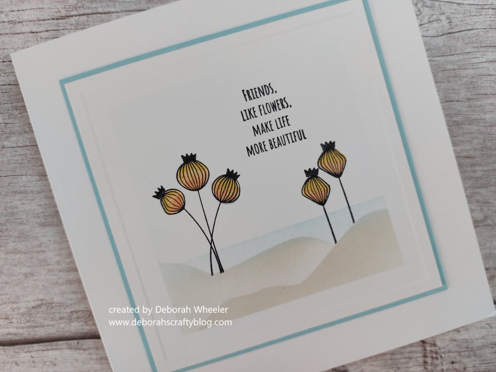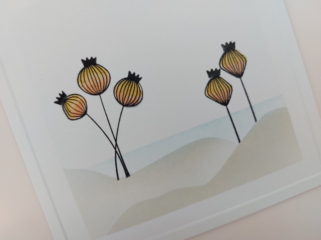 I used the lower part of the hills mask to cover the landscape and stamped a few of the seedpods in black Versafine Clair ink. Once the ink was dry, I coloured them with SU Write markers in ‘petal pink’ and ‘so saffron’, smoothing the shading with a colour blender pen, then stamped the little crowns on top of each seedpod. I popped one of Clarity’s square embedders on the front of the card with a bit of low tack tape and ran an embossing tool around it from the reverse side for a second frame outline.
