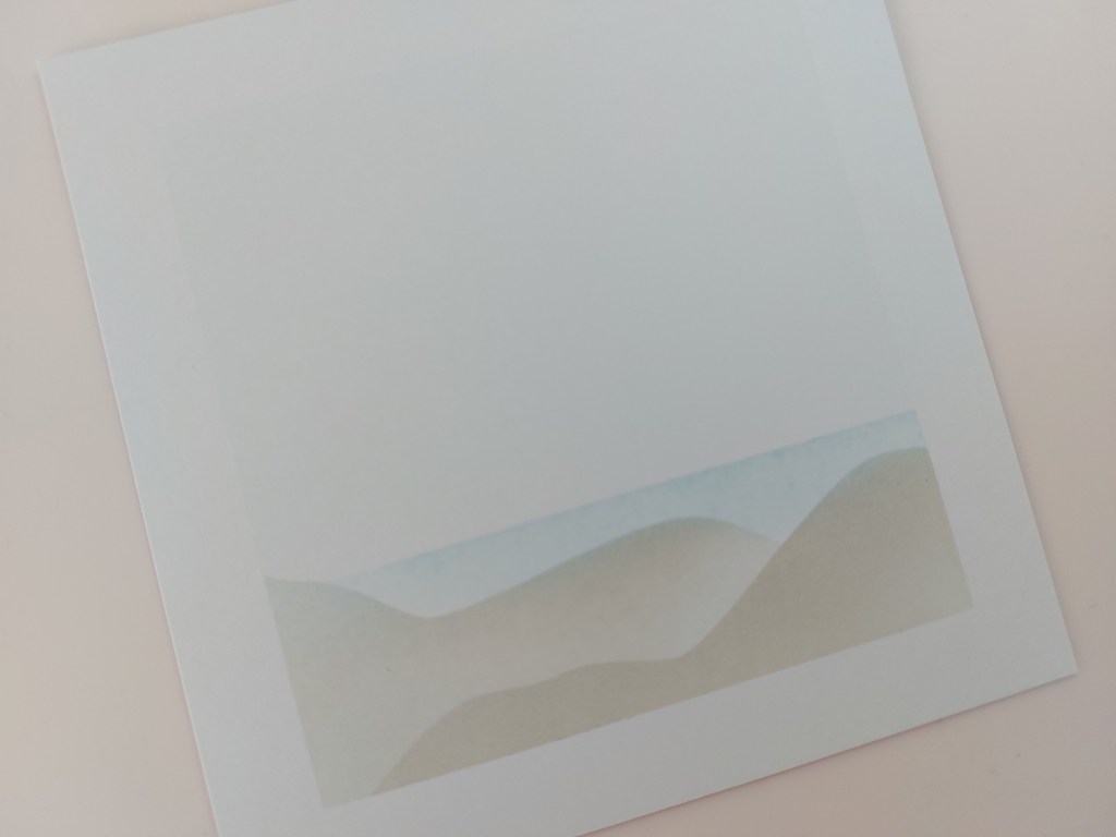I started by using Clarity’s ‘mountains, hills & waterline’ masks to create the landscape. I made a frame on a square of white card with low tack tape, then blended ‘pumice stone’ Distress Oxide across the hills part of the mask, repositioning it for the second one (I think they look like sand dunes). I added the waterline mask and blended ‘tumbled glass’ ink across it for the water, also lightly adding it around the rest of the masking tape to create the frame.