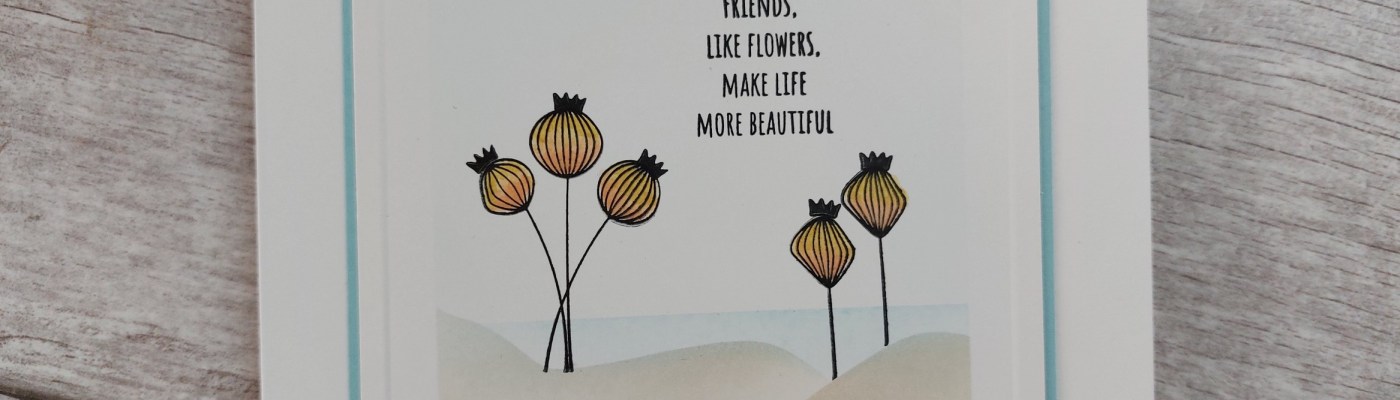 I used the lower part of the hills mask to cover the landscape and stamped a few of the seedpods in black Versafine Clair ink. Once the ink was dry, I coloured them with SU Write markers in ‘petal pink’ and ‘so saffron’, smoothing the shading with a colour blender pen, then stamped the little crowns on top of each seedpod. I popped one of Clarity’s square embedders on the front of the card with a bit of low tack tape and ran an embossing tool around it from the reverse side for a second frame outline.