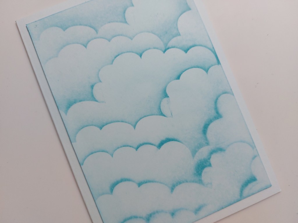 I started with the background and blended ‘broken china’ Distress Oxide across Clarity’s clouds mask to pick up the seven stripes in the sketch. I was a bit heavy handed with the ink in places, so lightly spritzed it with water and mopped with paper towel to lift a bit off – what it actually did was spread the ink a little more and blur it, which I quite like! Once dry I popped it onto an A6 card blank.