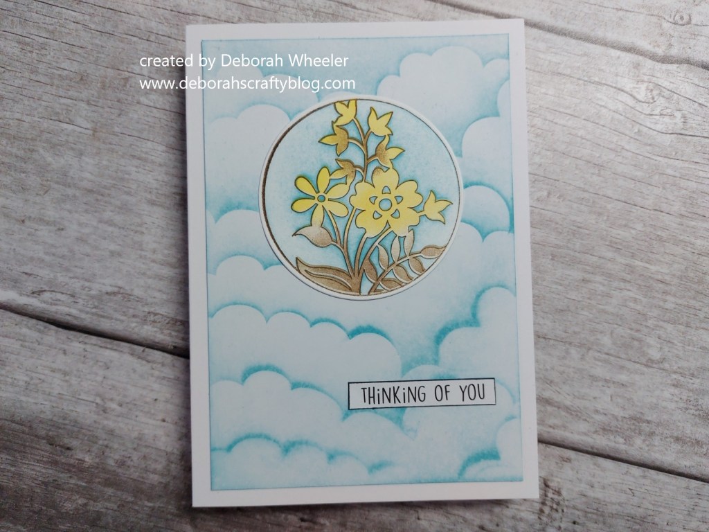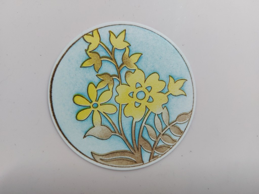 I stamped the outline image from the daisy set with ‘potting soil’ Archival ink, then covered it over with the matching stencil and blended ‘broken china’ into the background. There is a stamp in the set that will colour in the background, but I decided to blend the ink so it was the same depth as that for the clouds. I then used the infill stamp to add ‘mustard seed’ to the flowers and ‘walnut stain’ to the stems & leaves, using a small sponge to ink up the stamp. Once done, I cut it out with a nested circle die.