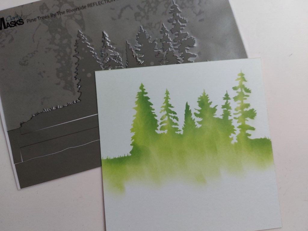 I started with the background and used sponges to drag ‘mowed lawn’ & ‘rustic wilderness’ Distress Oxides down onto white card through Clarity’s ‘pine trees’ mask from their Riverside Landscape Reflection set. I went around the edges and top with a stencil brush that just had a little ‘mowed lawn’ ink on it, to soften the white card.