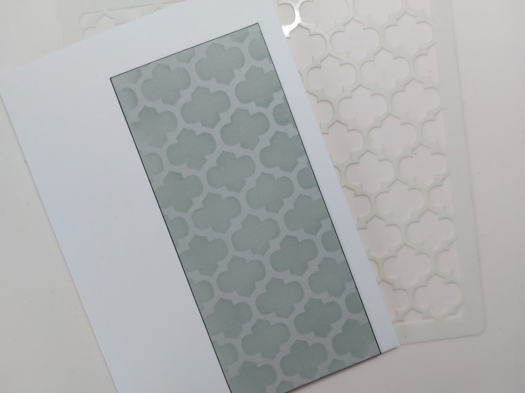 I started with a piece of Clarity’s Companion papers & blended ‘iced spruce’ Distress Oxide onto it through the ‘trellis’ stencil. After edging the paper with a black Sharpie, I attached it to a 5×7 card blank.