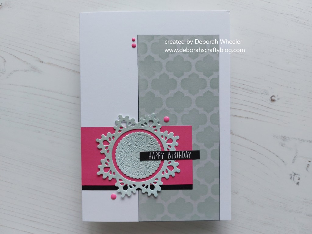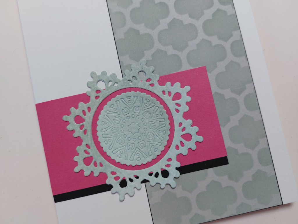 I’d used the ‘iced spruce’ as I found a scrap piece of card that I’d cleaned a brayer onto in that shade and used it to cut out the mandala die. I added a piece of pink paper with a narrow black strip to the card front, then glued the outer ring and inner circle of the mandala die – I’d managed to keep all the little bits in the centre piece of the die which give it a lovely textured pattern.