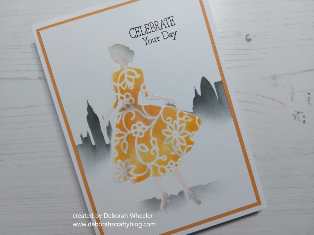 This is fantastic, Deborah. I just love your stenciling and the way you placed this elegant woman with the cityscape in the background. I LOVE it. Thanks so much for playing with us at Time Out!