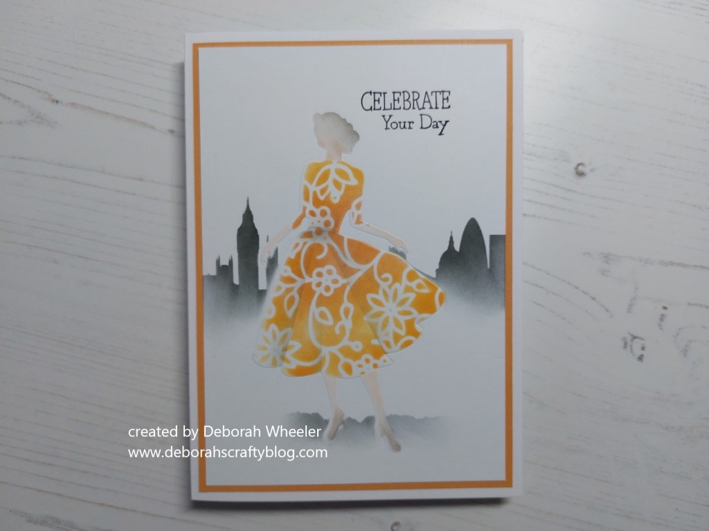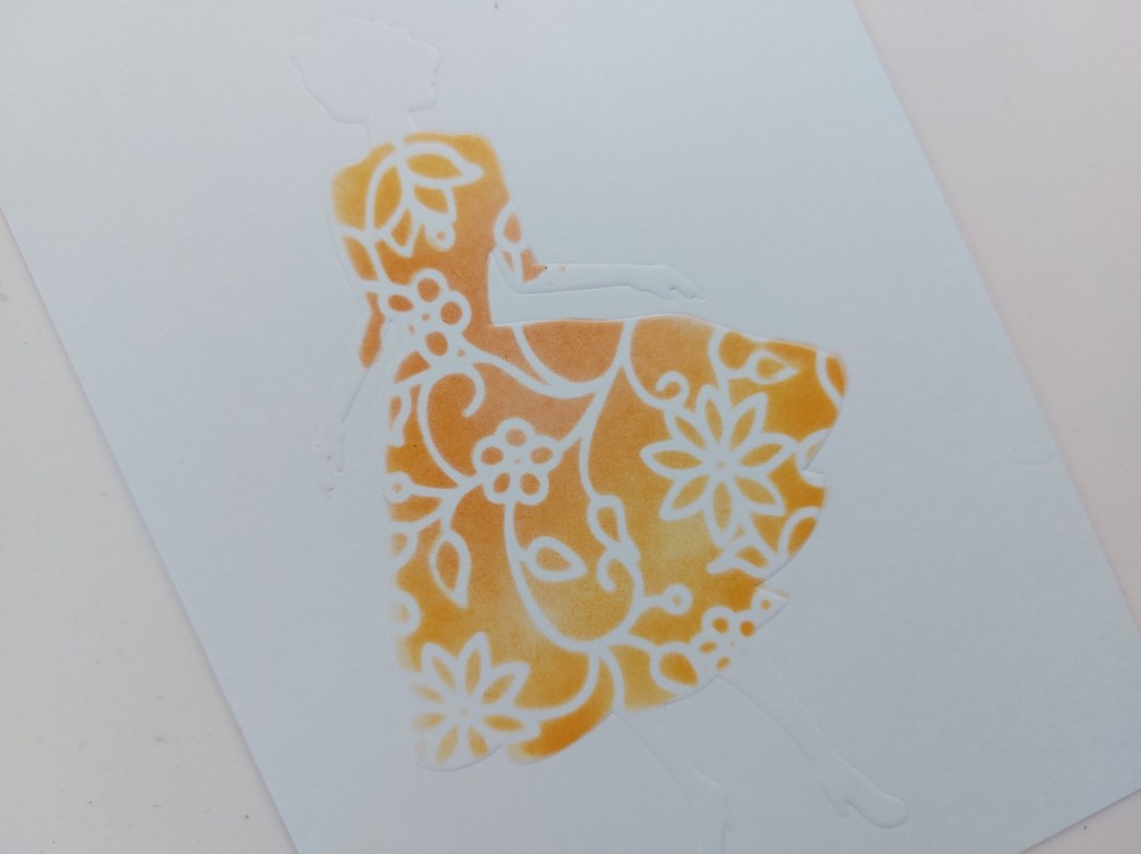 I started by embossing the stencil outline onto a piece of white card cut to fit a 5×7 card blank – I taped the stencil on a hinge across the top of the card so I didn’t have to keep removing it and then ran it through my embossing machine using a rubber shim. I used bits of masking tape to cover her head, arms & legs, popped Clarity’s ‘floral flourish’ stencil under the ‘elegant ladies’ one and sponged ‘ripe persimmon’ and ‘dried marigold’ through it. I’d normally use a brush to blend inks, but the stencil design is so fine it easily moves with a brush & I get a blurry image, so I dabbed with a sponge instead.