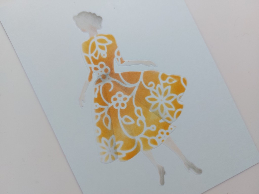I reversed the masking tape to then cover the edges of the dress (still keeping the stencil outline in place) and blended ‘tattered rose’ Distress Oxide and ‘watering can’ Archival inks onto her head, arms and legs. I then used a torn piece of copy paper to gently sponge the ‘watering can’ along to create the shadows on the folds in her dress.
