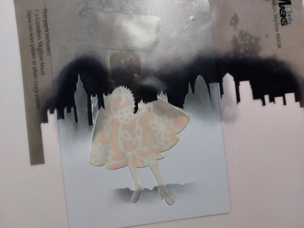 I removed the outline stencil and replaced it with the inner piece, taping it into place across her head to act as a mask. I laid Clarity’s ‘London skyline’ mask across the card and gently dragged ‘black soot’ Distress Oxide down across it with a sponge. I also used a torn piece fo copy paper to add the ground for her to stand on.