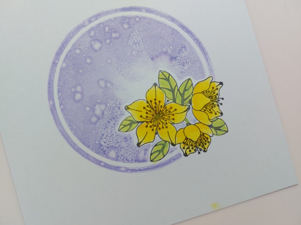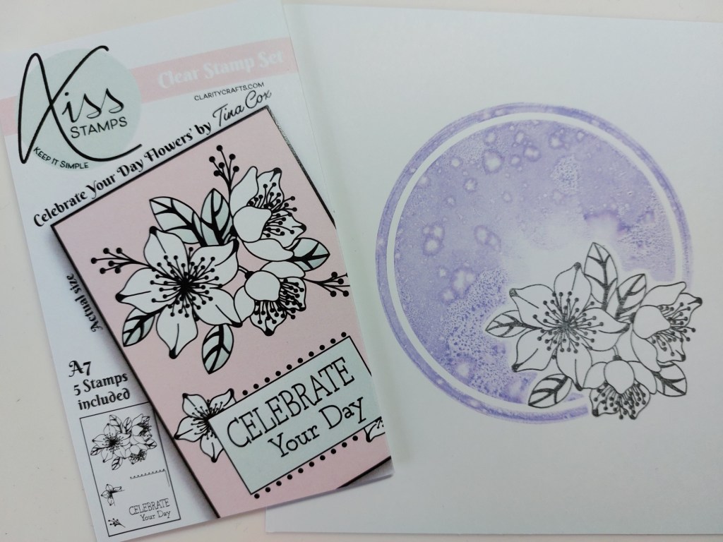 I started by stamping the flowers onto a square of white card, then stamped them again onto an all-over sticky note which I fussy cut to create a mask. After covering the flowers, I sponged ‘shaded lilac’ Distress Oxide onto Clarity’s small circle backdrop stamp, spritzed it with water and stamped it onto the card. I have to be honest, I was a bit heavy handed with the spritzing but I quite like the effect!