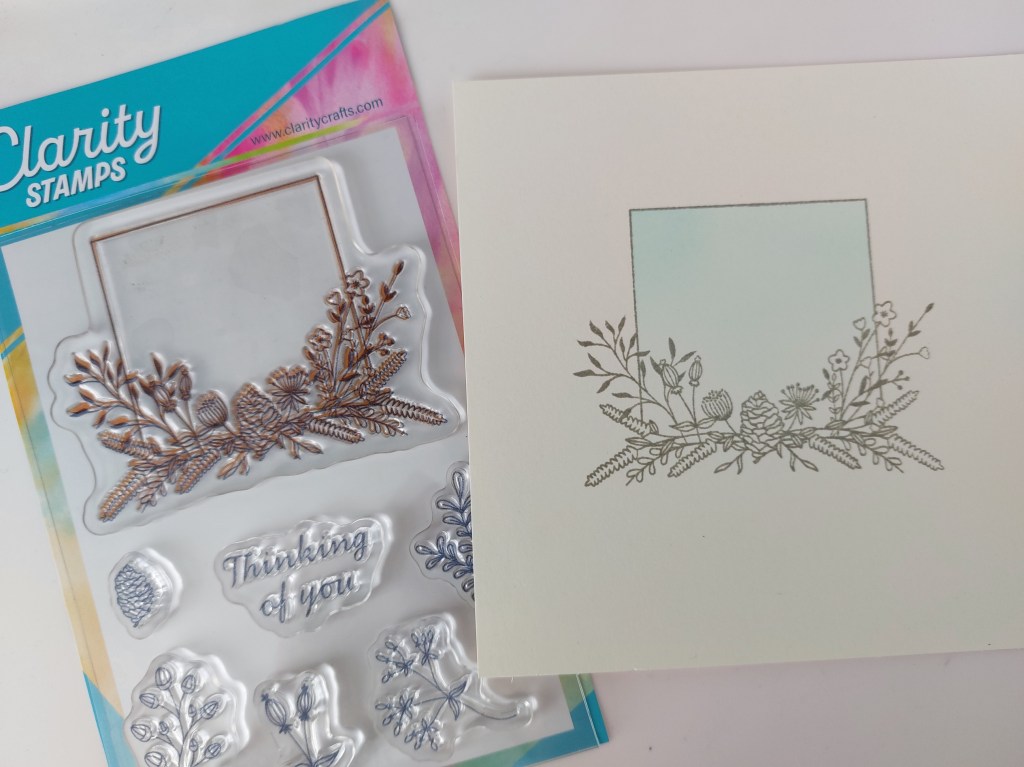 Hello there. My new ‘floral delights’ stamps from ClarityCrafts arrived this week, so I made a start on playing with them – well, it would be rude not to! I thought the ‘thinking of you’ set would work well with this week’s colours at Global Design Project and picked up the top row of foliage, pastel colours & sentiment from TicTacToe‘s grid.