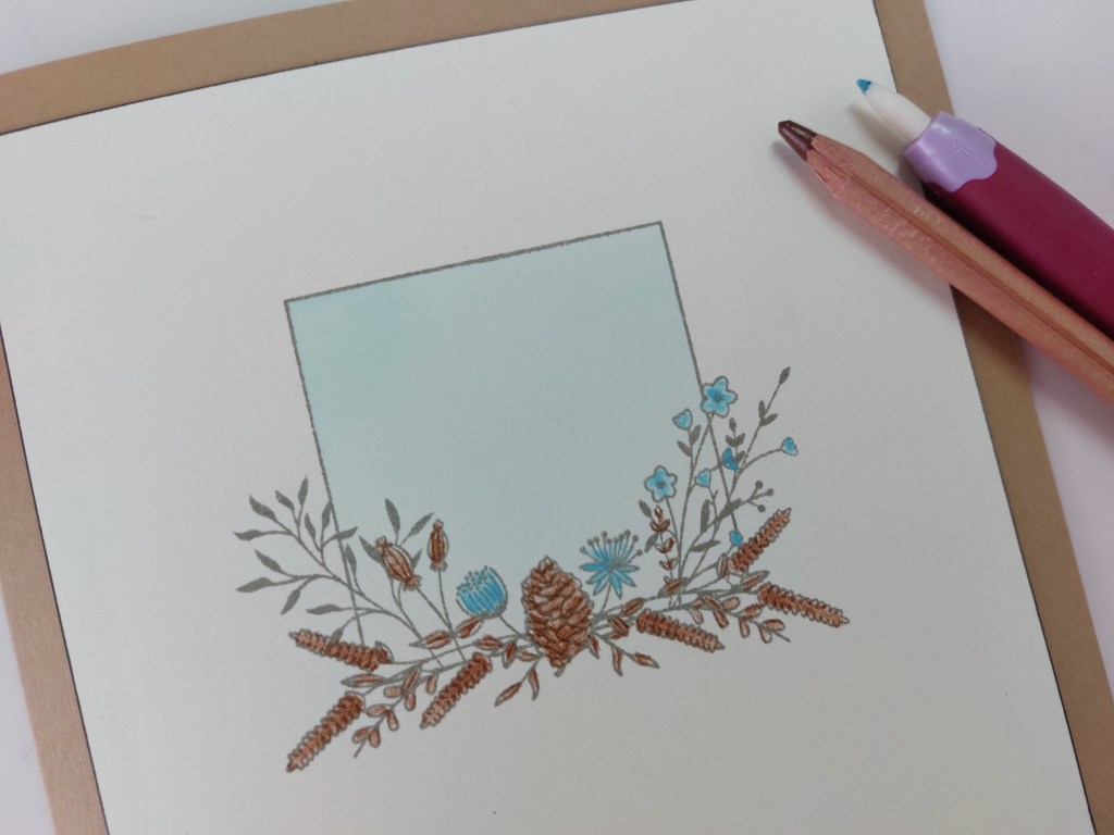 I used a light brown Pergaliner pencil to shade in the foliage and added ‘salvaged patina’ ink to the flowers with a Pergamano blending nib, picking the ink up off my craft mat. I ran a black Sharpie around the card edges and attached the square to a 6×6 kraft card blank.