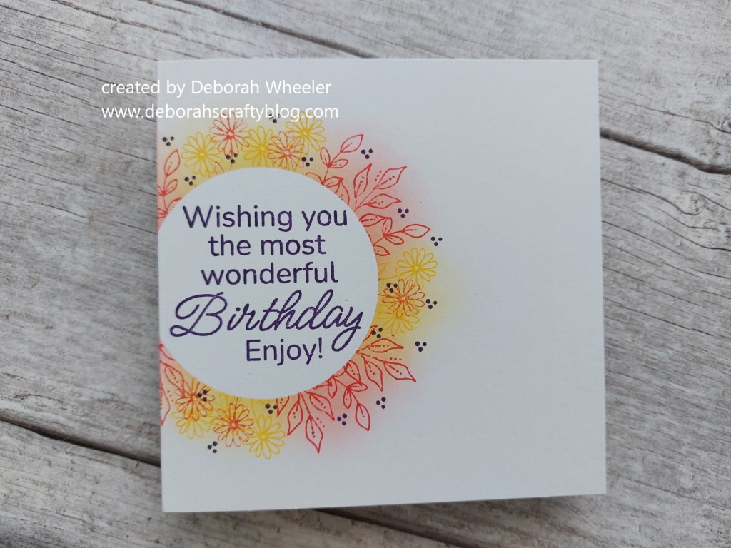 I filled the centre of the circle with one of the ‘sweet sentiments’ stamps, again using the ‘villainous potion’ Distress Oxide. I had intended to stop there, but felt the card didn’t look quite balanced. I decided the yellow areas needed a bit more definition, so popped the mask back into place and added a few of the little daisies in ‘festive berries’ – just what was needed!