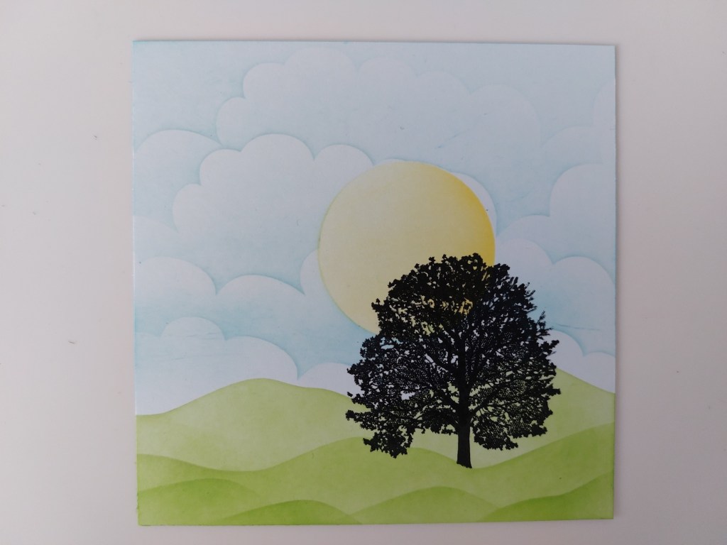 I used the ‘hills’ mask to cover up part of the landscape and then stamped one of the trees from the set in black Versafine Clair ink – masking the ground off meant I could sit the tree in a dip on the landscape.