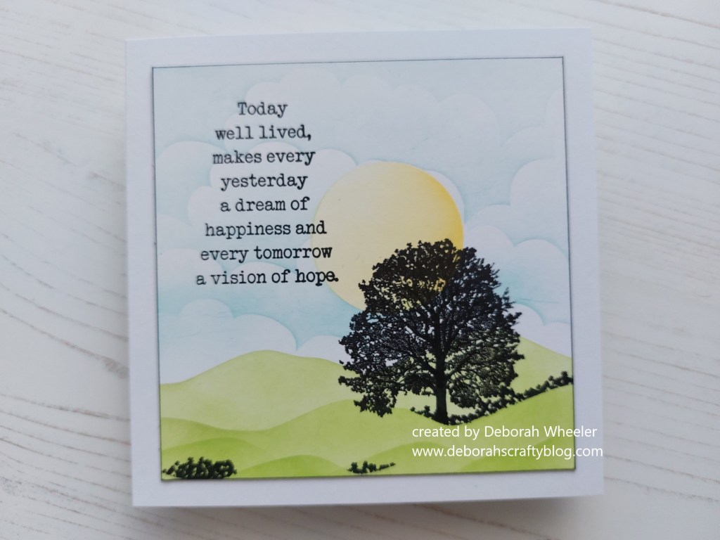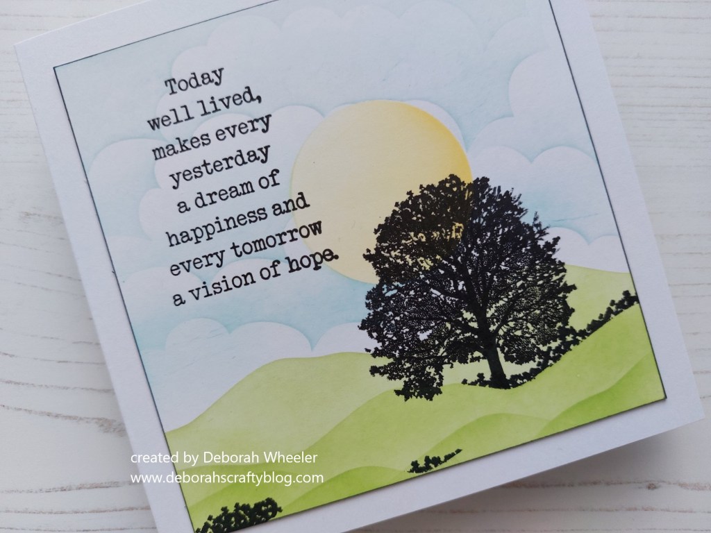 I love this peaceful scene you’ve created Deborah! Your masking worked beautifully to nestle the tree into the dip and then create the bushes and foliage. Wonderful card! Thanks for sharing it with us at Just Us Girls!