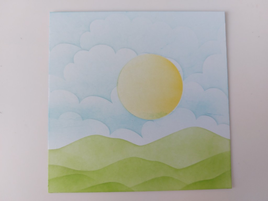 I started with a square of white card that I’d cut down to fit on a 5×5 card blank. The first step was to use the outer part of a circle mask to create the sun with ‘mustard seed’ Distress Oxide and a blending brush. I then covered it over with the inner part of the mask before creating the landscape with Clarity’s ‘hills’ mask & ‘mowed lawn’ Distress Oxide, followed by the sky in ‘broken china’ with their ‘clouds’ mask.