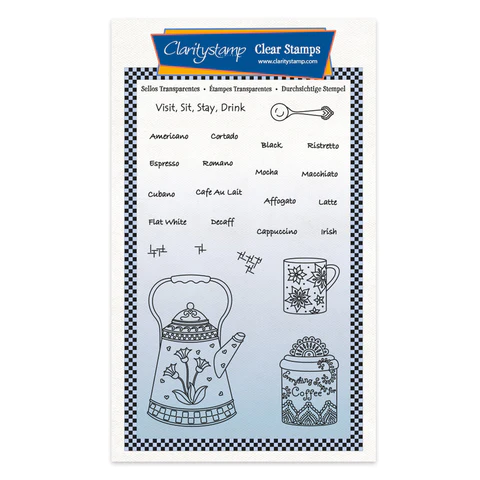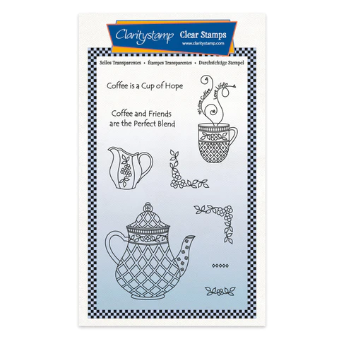 Welcome to my crafty blog and the start of another week! I like nothing better than meeting friends for coffee (and food!), so Linda Williams’ coffee themed stamp sets for ClarityCrafts are perfect for me