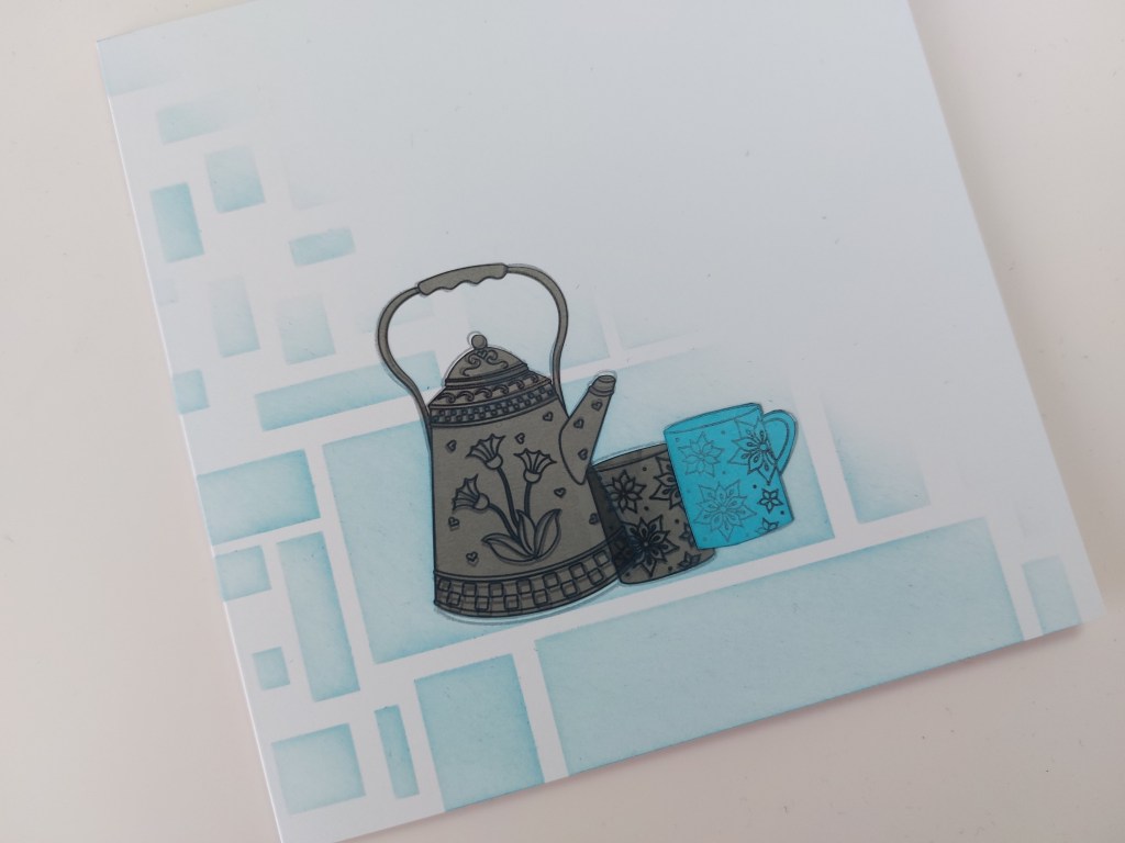 This is a one layer card (it’s totally flat), so I started by stamping one of the coffee mugs from Linda’s ‘visit, sit, stay, drink’ set onto a 6×6 card blank. I covered it with the pre-cut mask that comes with the set and stamped a second mug to sit behind it. There’s only one coffee mug mask in the set, so I cut a second one from an all-over sticky note to cover it up. I added the coffee pot to the left and also masked that off. I then used the ‘abstract squares 3’ stencil to create the background, lining the pot and mugs up against a larger aperture before brushing ‘broken china’ Distress Oxide through it. The stencil didn’t quite reach to the top of the card on the left, so I repositioned it and added a little more at the top.
