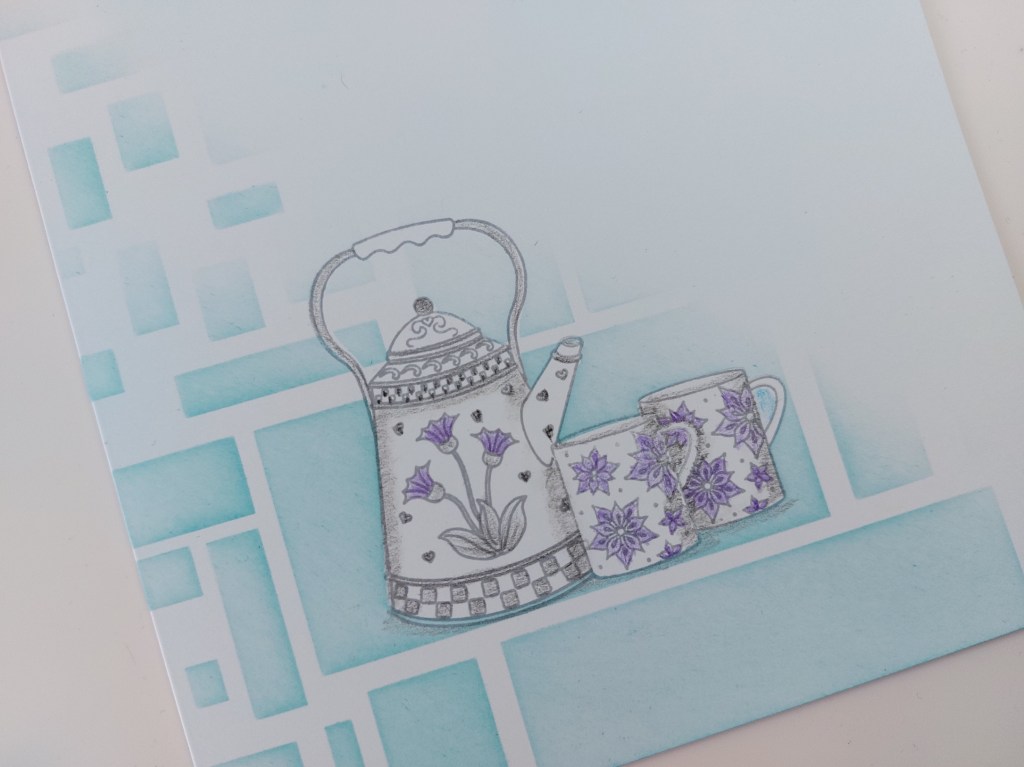 I removed the masks and shaded in the design on the pot and mugs with purple and grey Pergaliner pencils.