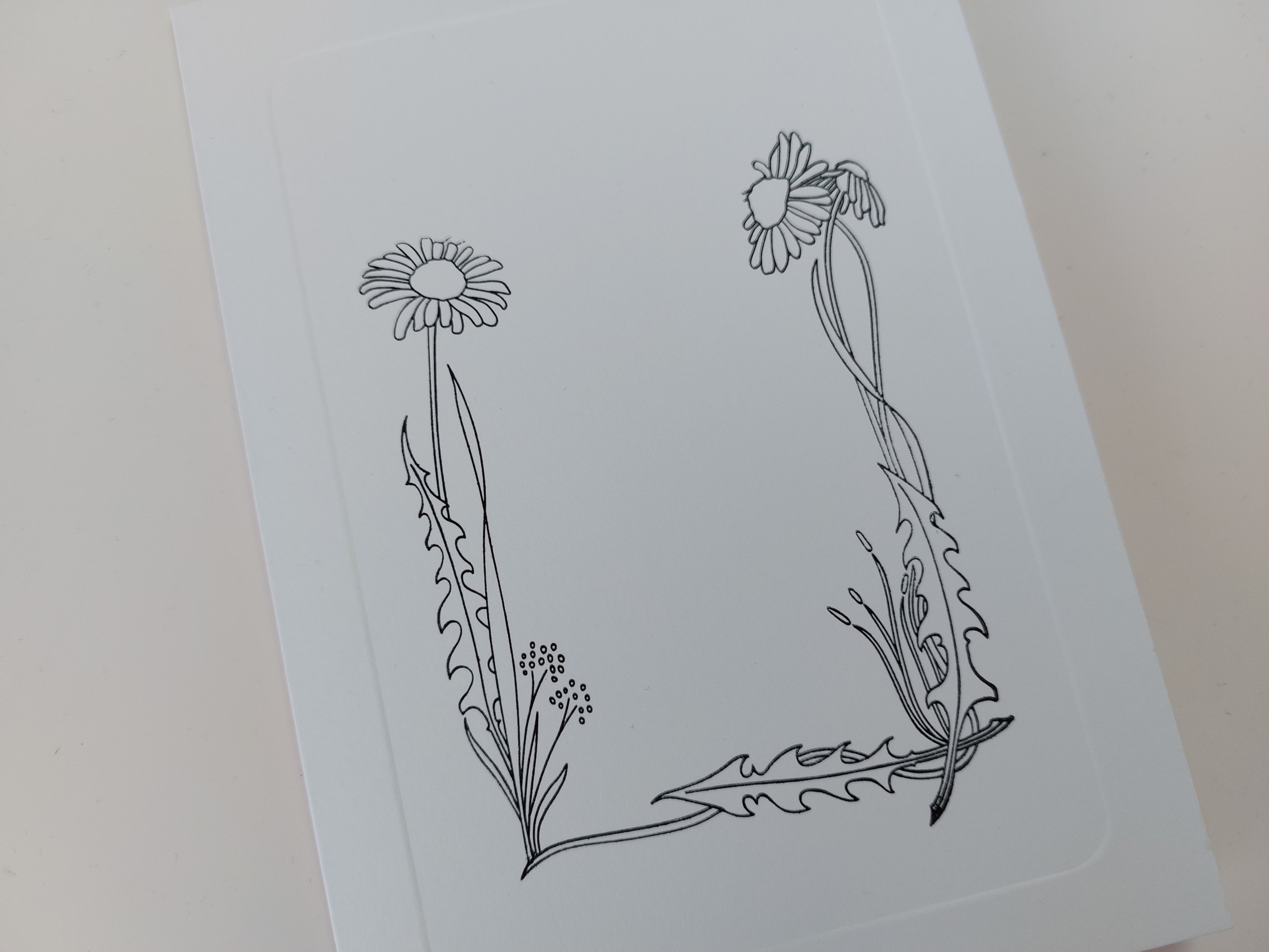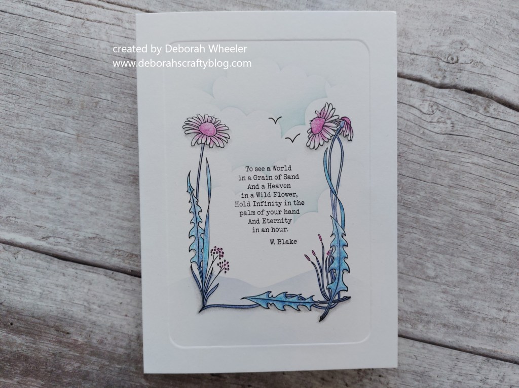 I felt it needed a little something in the background, so lightly brushed ‘chipped sapphire’ Distress Oxide aross Clarity’s ‘hills’ mask to ground the flowers, together with ‘broken china’ across the ‘clouds’ mask for a light sky. I also added a drop shadow around the flowers and leaves using a grey pencil, so it didn’t look quite so flat.