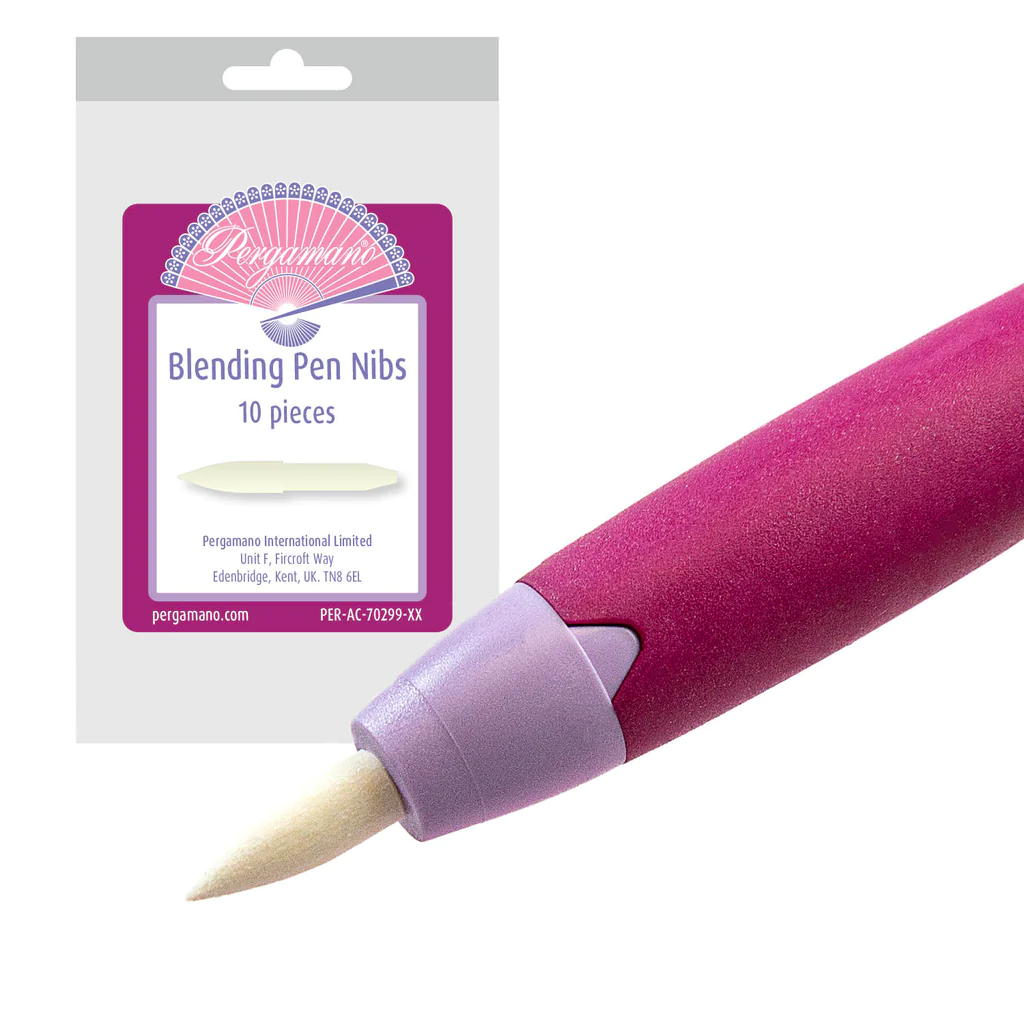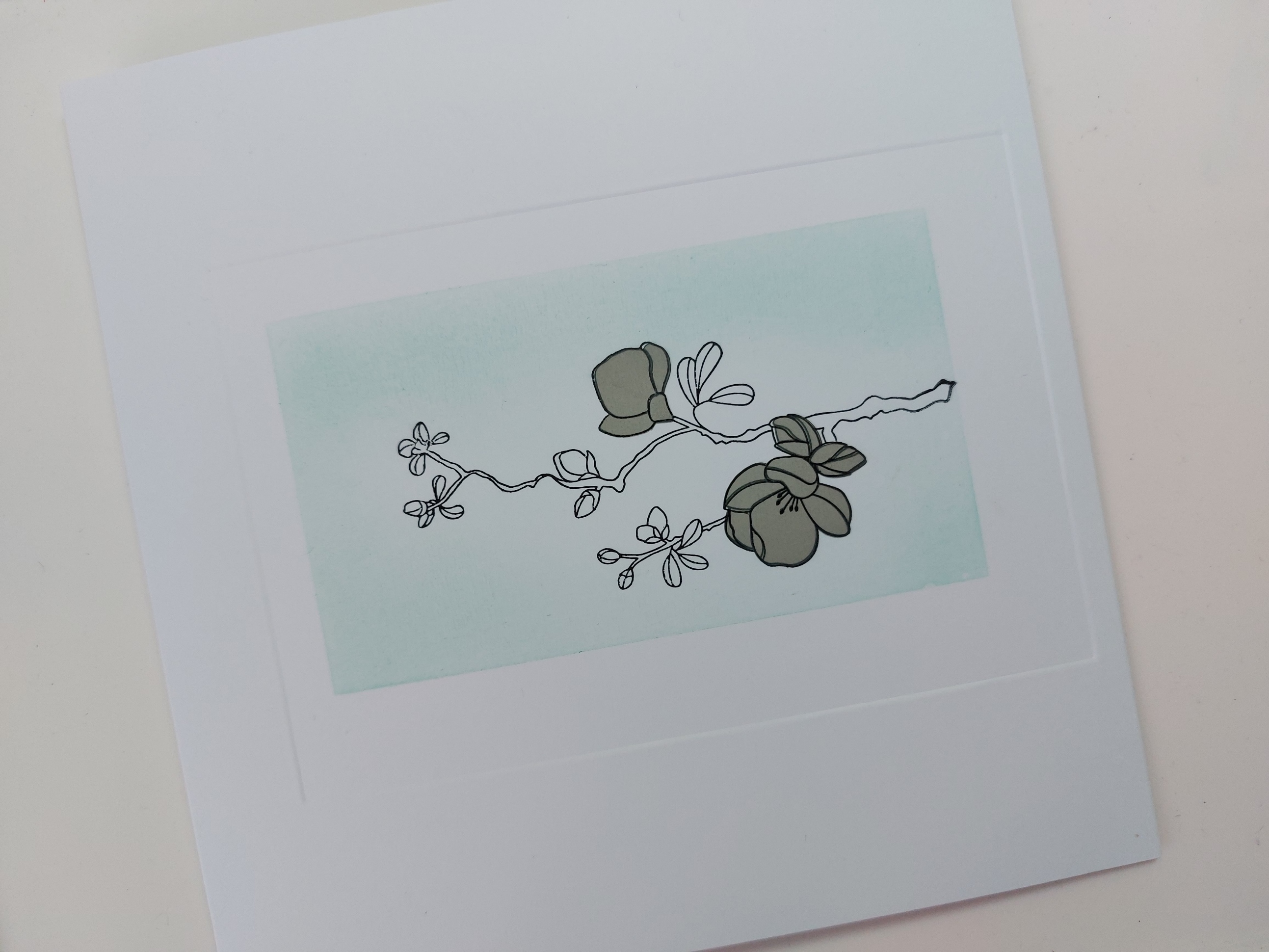 The next step was to use Pergaliner pencils to shade in the blossoms, leaves & branch. I used the red (B11) for the blossoms, blending it out with a Pergamano nib and a little Dorso oil (first time I’ve tried this after seeing Barbara Gray demo it on the telly!) I didn’t have the right shade of aqua for the leaves and branches so used two colours, putting down an undercoat of the turquoise (B16) and blending the light green (A13) over the top, which worked really well.