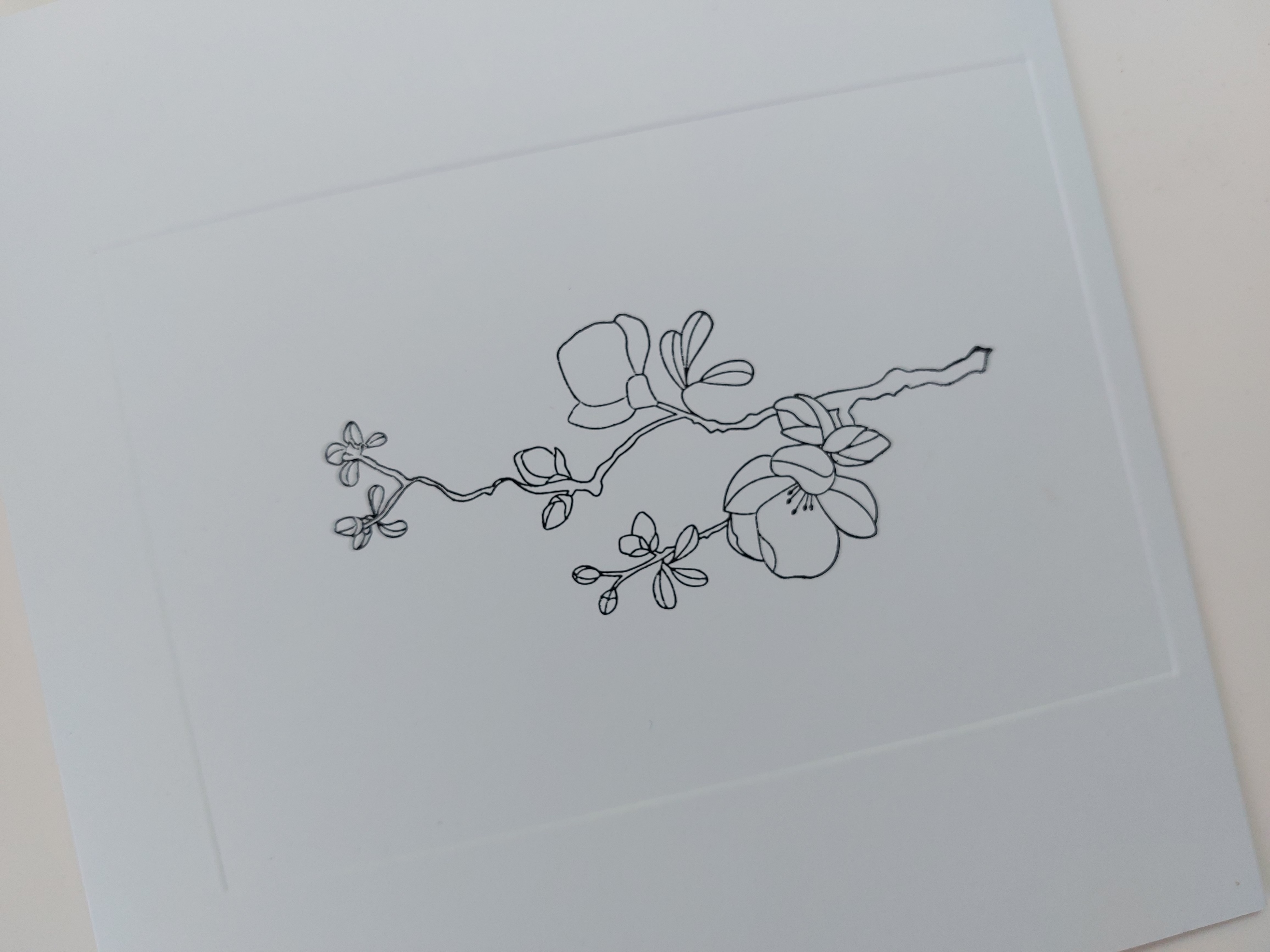 I started with a 7×7 card blank and used one of the rectangle embedders to create the frame on the front. I stamped the long japonica bough into the frame and then used two of the pre-cut masks that come with the set to cover the large blossoms. I laid the ‘rectangle aperture mat’ A4 stencil onto the card from so that the largest rectangle sat over the bough and masked it off around the sides with low tack tape. I then brushed ‘salvaged patina’ Distress Oxide through it, keeping the ink towards the outer edges and leaving the centre clear.