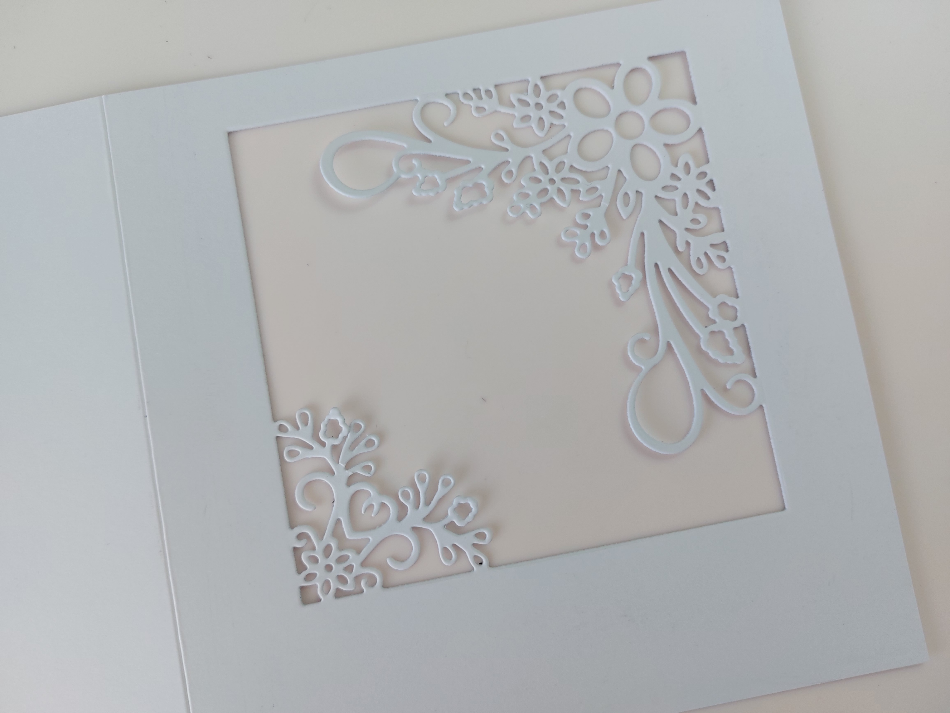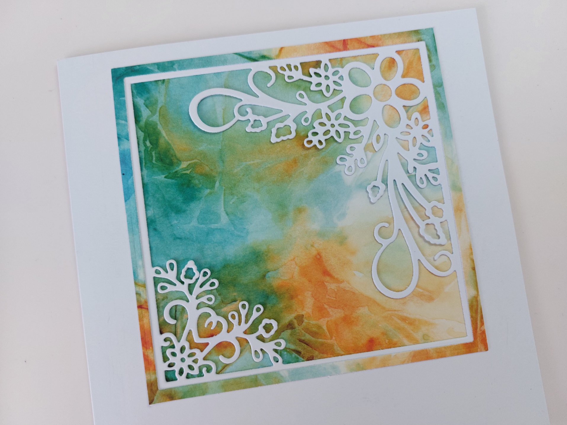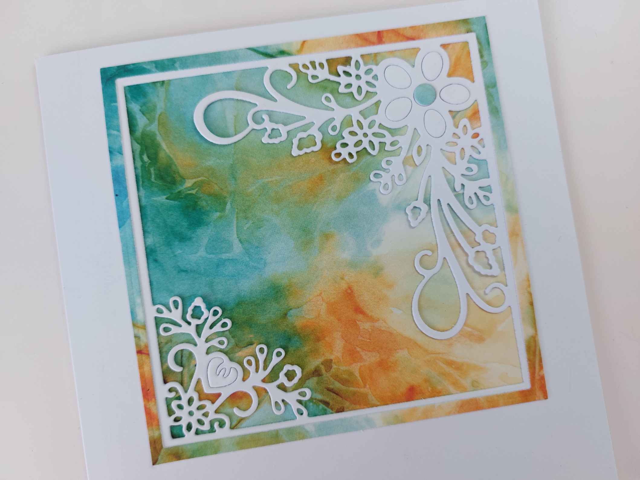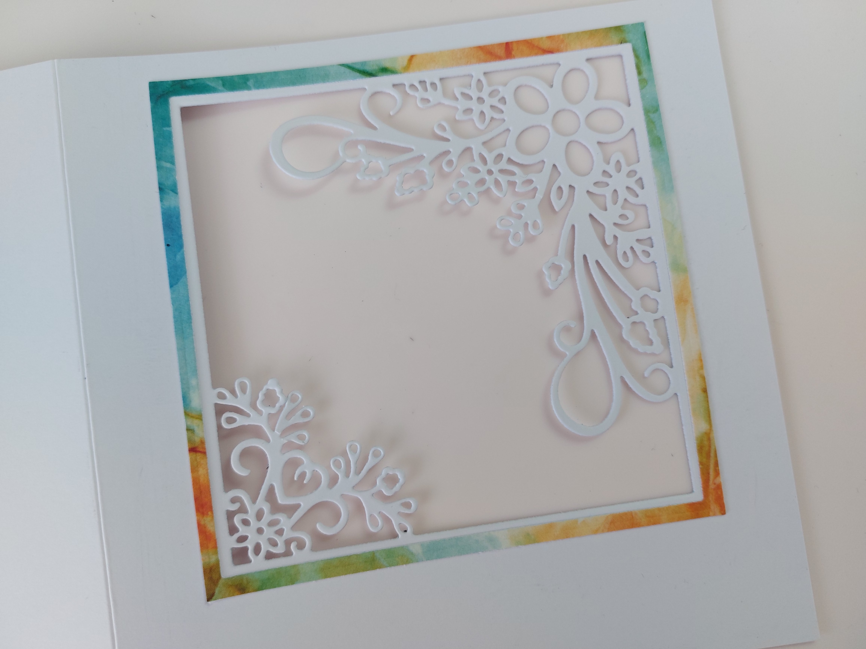The first spet was to cut the aperture die into the front of a card blank. I started with a 6×6 card, but wanted more white space around the image so swapped it up to a 7×7. I cut a square of ‘Waimea Falls’ designer card and used a nested square die to cut an outer frame from it, planning to use the centre part to sit behind the die cut – the frame was glued onto the card front.