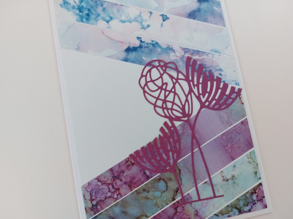 I trimmed a base piece of white card to fit a 5×7 card blank and marked out the centre on the right with a pencil, together with the two points on the left to line up the paper strips. I cut the two patterned papers into strips 2cm wide (I could probably have made them a bit narrower – one for next time!) and then started by gluing the purple toned strips onto the bottom of the card. The trick with this is to start with the top piece, lining it’s edge with the pencil marks, and then work down, leaving a small gap between each one. I keep each strip longer than I need, then flip the card over and use scissors to trim them level with the edge of the card base. I then repeated the process with the blue/pink toned strips at the top, again starting with an edge across the two pencil marks and working outwards. Once the strips were trimmed down I attached the card base to the 5×7 card blank.