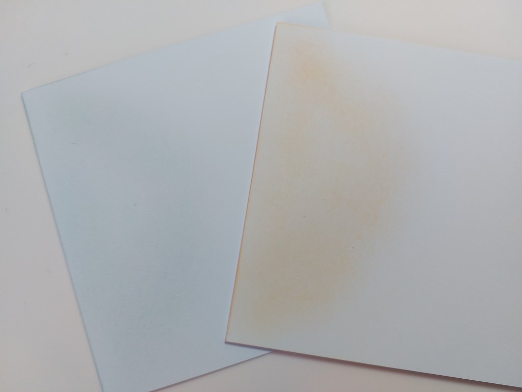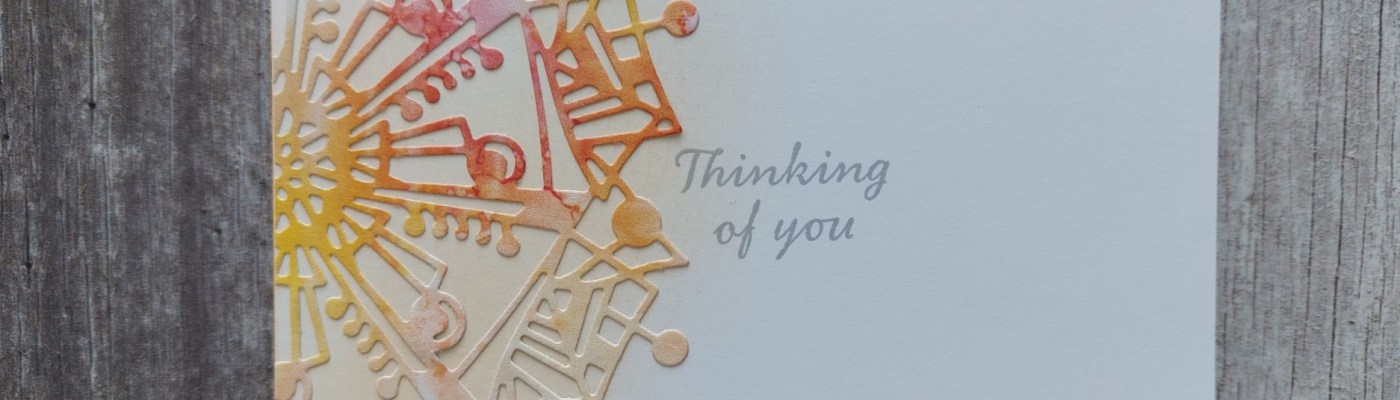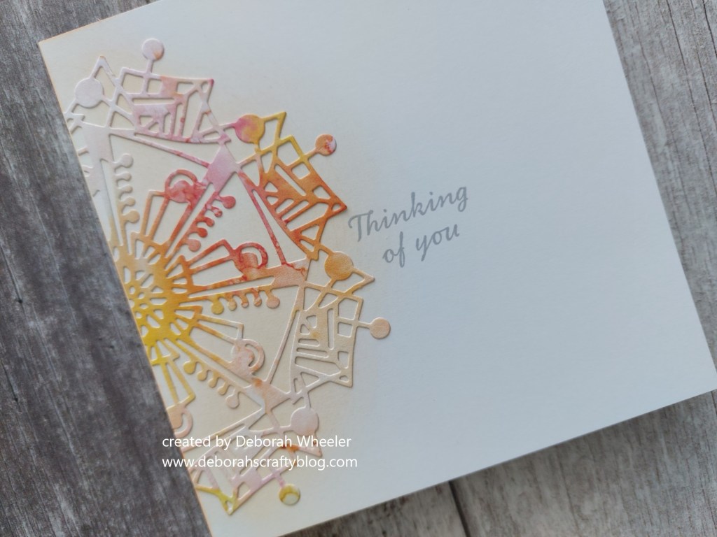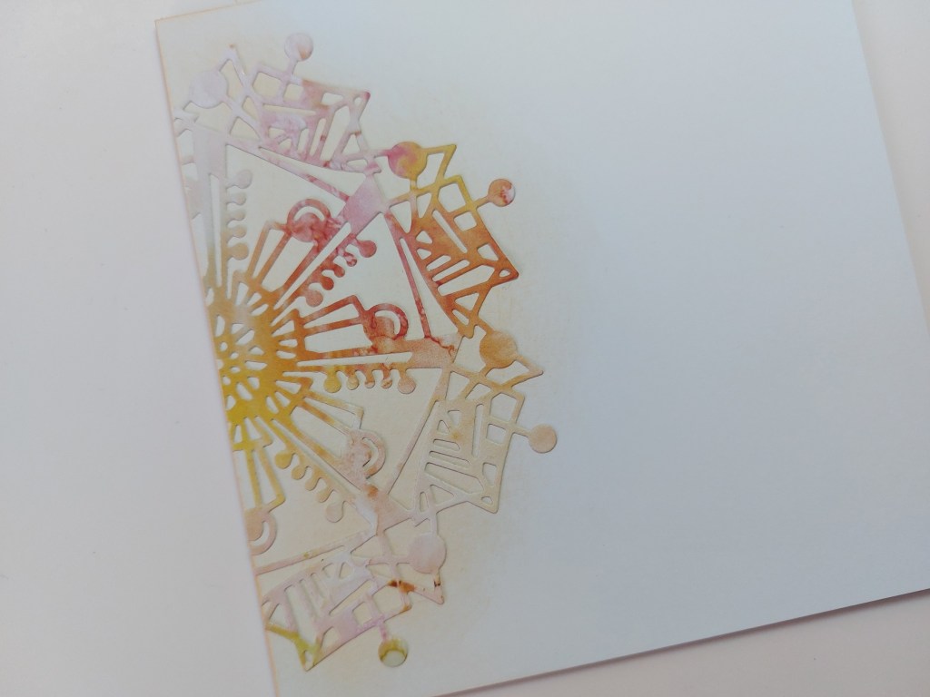 The ‘abstract snowflake’ is quite a large die, so I opted to just use half of it. I started by lightly brushing Distress Oxide ink onto a 6×6 card blank in a semi-circle from the folded edge. I had originally planned to use ‘speckled egg’ but didn’t like how that then looked against the piece of Amazonia paper I’d used, so did a second card blank using ‘dried marigold’ ink.
