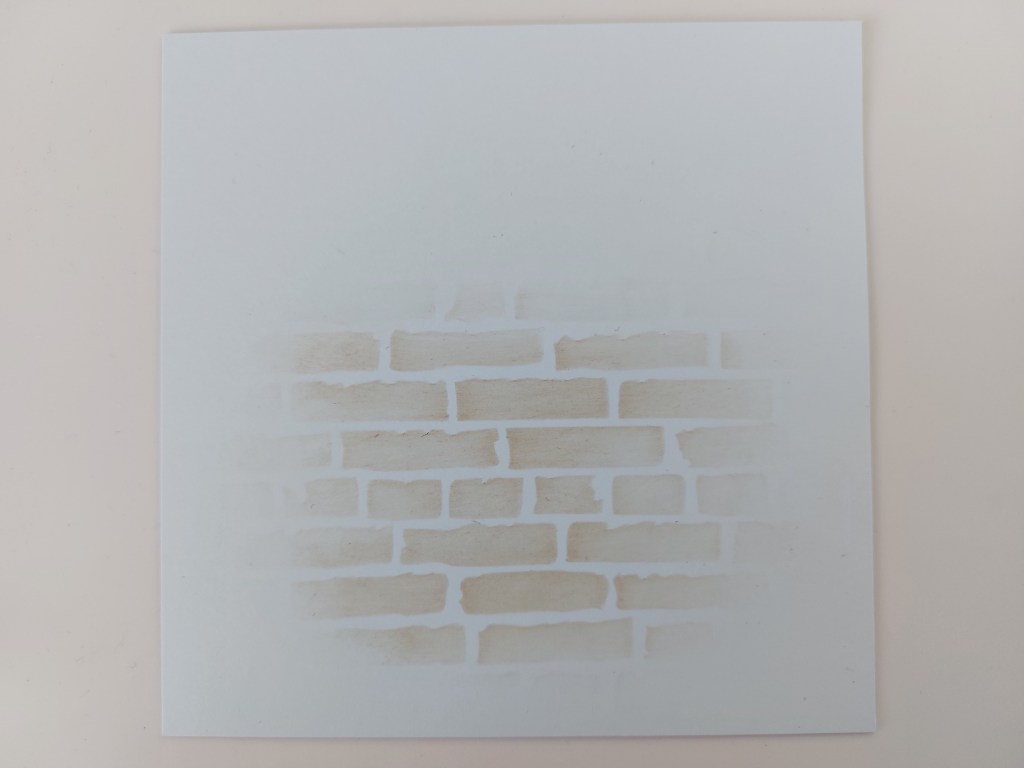 I started by creating the background on a square of white card by lightly brushing ‘walnut stain’ Distress Oxide trhough ClarityCrafts’ ‘brick wall’ stencil, keeping it to the centre of the card.