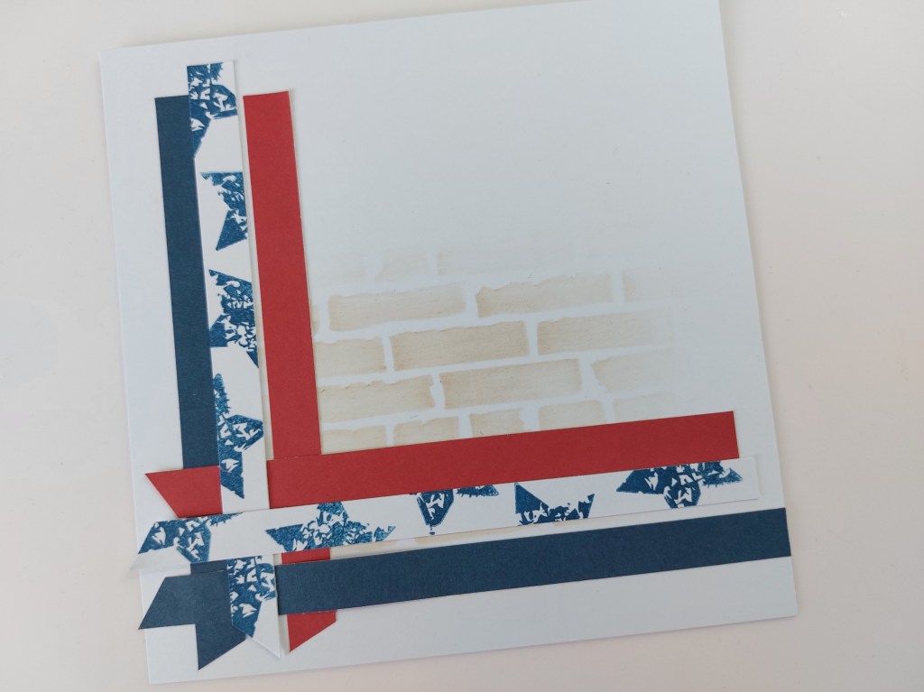 I cut 1cm strips of red & blue paper from offcuts of ‘Waimea Falls’ companion paper, together with a couple of ones in white card (I’ve got a whole box of white card scraps that I need to get used up!) I used the star stamp from the ‘grunge shapes’ that was Clarity’s May Craft Club set to stamp across the white strips, using ‘cobalt’ Archival ink.