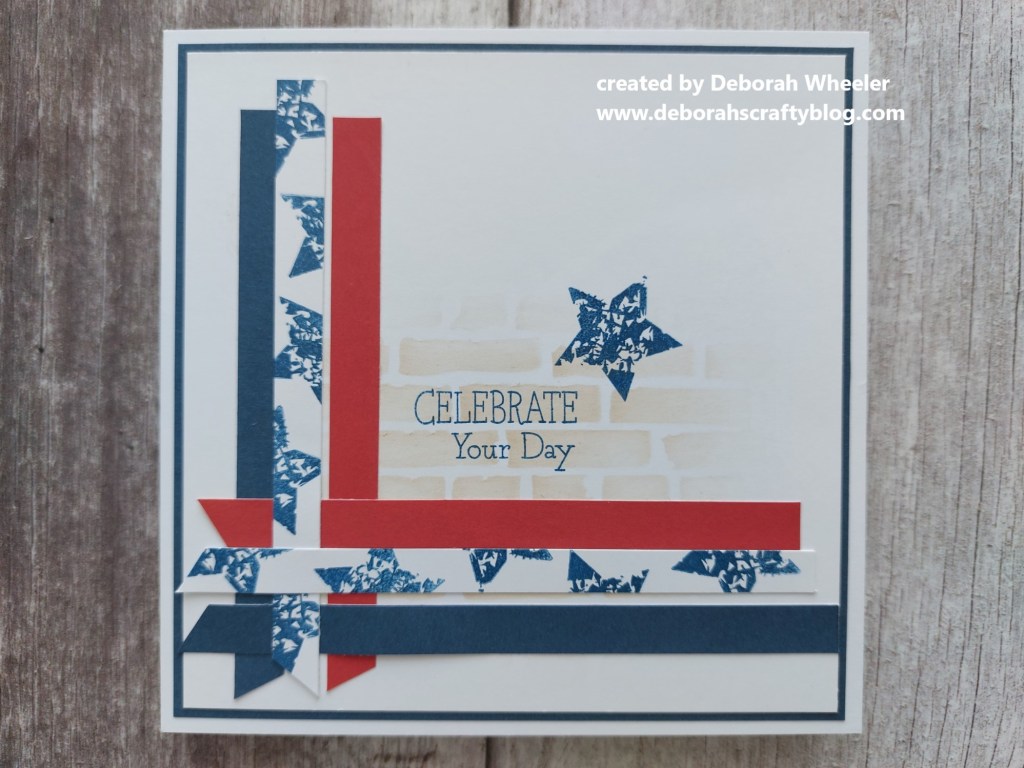 Hello there! I’m back with some more strips of scrap paper on today’s card, which will be heading off to an friend of mine from New York who always throws a 4th of July party for her American friends in London. I thought I’d have a second punt at Just Add Ink‘s ‘choose two’ challenge, this time with narrower strips of paper using the palette from Color Throwdown